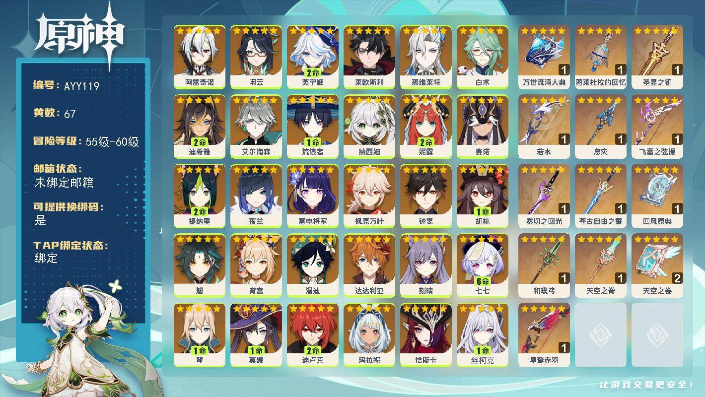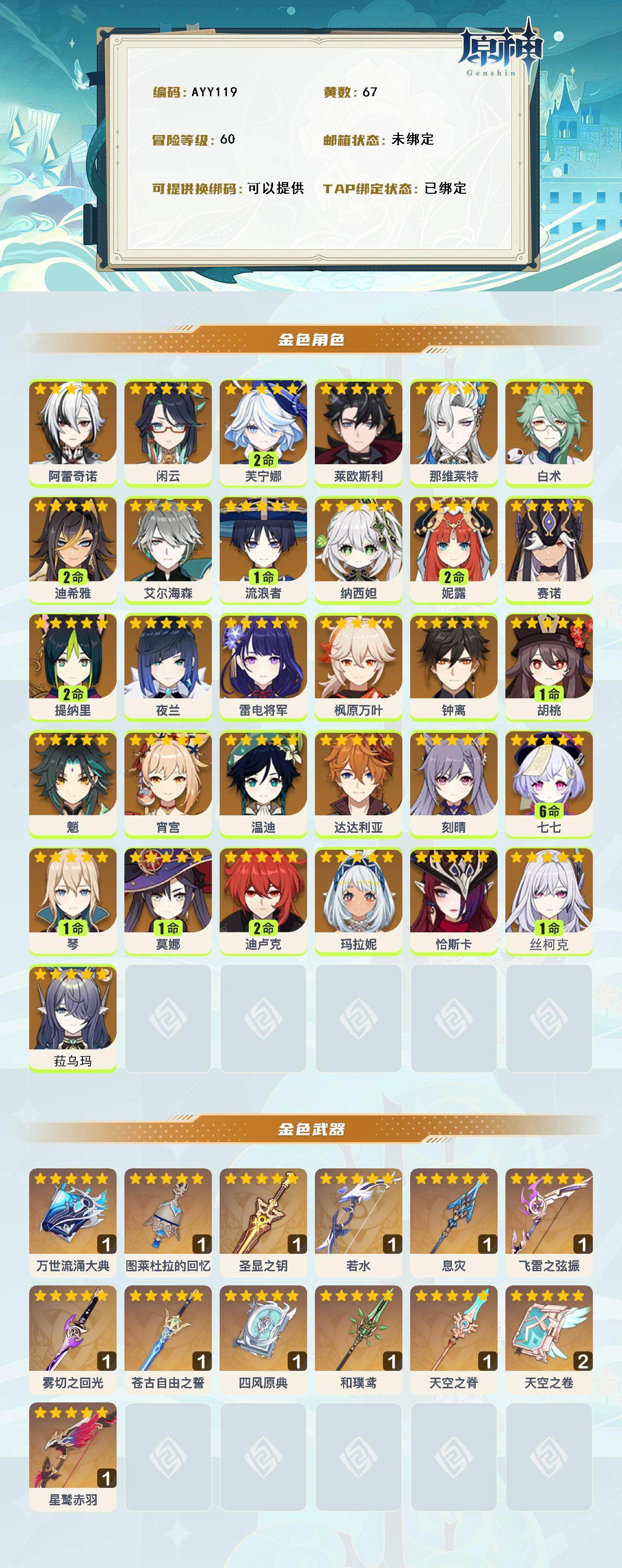 [15144343]60级/67黄/女主/31个五星角色/14个五星武器 0命阿蕾奇诺,0命闲云,2命芙宁娜,0命莱欧斯利,0命那维莱特,0命白术,2命迪希雅,0命艾尔海森,1命流浪者,0命纳西妲,2命妮露,0命赛诺,2命提纳里,0命夜兰,0命雷电将军,0命枫原万叶,0命钟离,1命胡桃,0命魈,0命宵宫,0命温迪,0命达达利亚,0命刻晴,满命七七,1命琴,1命莫娜,2命迪卢克,0命玛拉妮,0命恰斯卡,1命丝柯克,0命菈乌玛,精1万世流涌大典,精1图莱杜拉的回忆,精1圣显之钥,精1若水,精1息灾,精1飞雷之弦振,精1雾切之回光,精1苍古自由之誓,精1四风原典,精1和璞鸢,精1天空之脊,精2天空之卷,精1星鹫赤羽