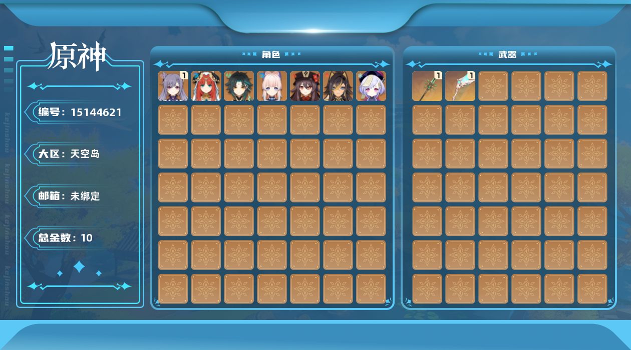 - [15534063]56级/39黄/女主/14个五星角色/11个五星武器 0命迪希雅,满命纳西妲,0命提纳里,0命夜兰,2命荒泷一斗,0命枫原万叶,0命钟离,0命宵宫,1命刻晴,3命七七,0命琴,0命莫娜,1命迪卢克,0命丝柯克,精1千夜浮梦,精2圣显之钥,精1息灾,精1赤角石溃杵,精1苍古自由之誓,精1四风原典,精1天空之翼,精1天空之刃,精1尘世之锁,精1风鹰剑,精1狼的末路