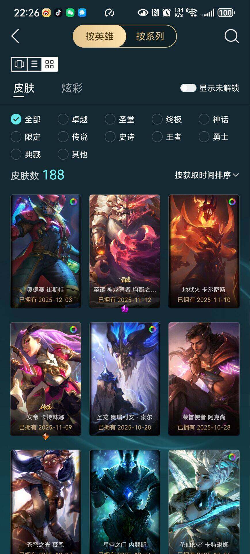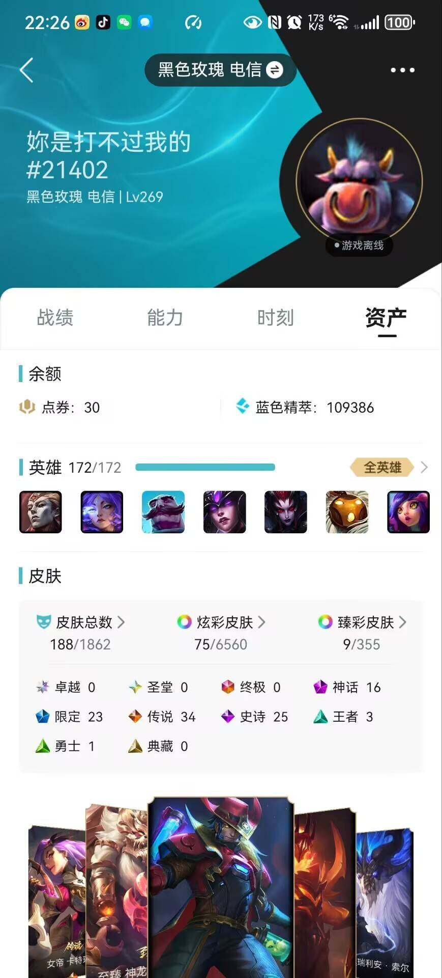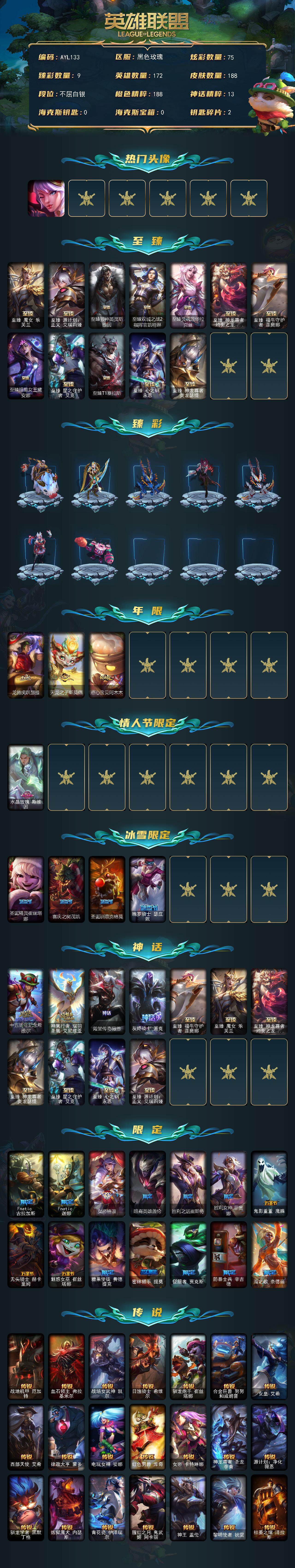 [15144708]白银段位-172英雄-188皮肤-75炫彩-0终极-16神话-23限定-34传说-25史诗