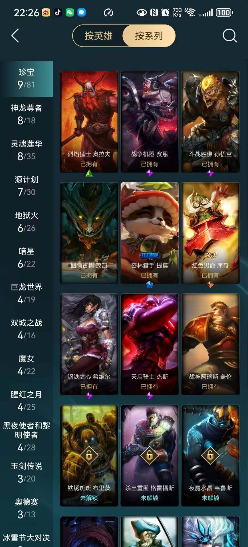 【史诗皮肤】:战争机器赛恩,钢铁之心希维尔,兔宝宝提莫,荒野豺狼沃里克,五杀摇滚键盘手娑娜,恐惧新星普朗克,绝代智将斯维因,沙漠风暴卡特琳娜,枯萎之壤雷克顿,暗星嘉文四世,三昧真火孙悟空,斗战胜佛孙悟空,苍