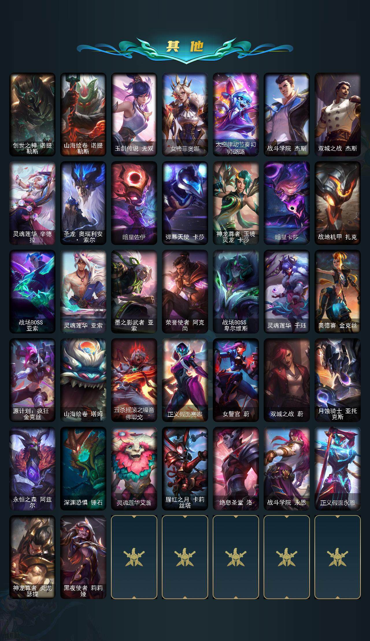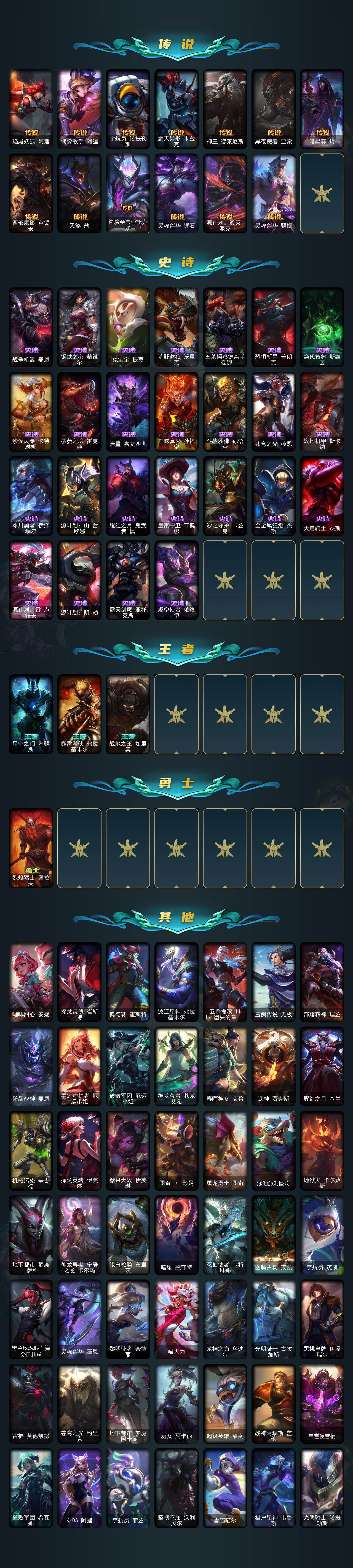 【传说皮肤】:战地机甲厄加特,血石领主弗拉基米尔,战场女武神凯尔,日蚀骑士希维尔,驯龙炮手崔丝塔娜,合金巨兽努努和威朗普,女皇艾希,西部天使艾希,律政大亨蒙多,电玩女神娑娜,红色男爵库奇,女帝卡特琳娜,神龙尊者圣龙李青,源计划净化薇恩,驯龙学者黑默丁格,炼狱魔犬内瑟斯,青花瓷伊泽瑞尔,腥红之月鬼武姬阿卡丽,神王盖伦,黎明使者锐雯,枯萎之壤泽拉斯,焰尾妖狐阿狸,偶像歌手阿狸,宇航员诺提勒斯,霸天异形卡兹克,神王德莱厄斯,黑夜使者亚索,暗星尊烬,西部魔影卢锡安,天煞劫,海魔至尊亚托克斯,灵魂莲华锤石,源计划毁灭派克,灵魂莲华瑟提