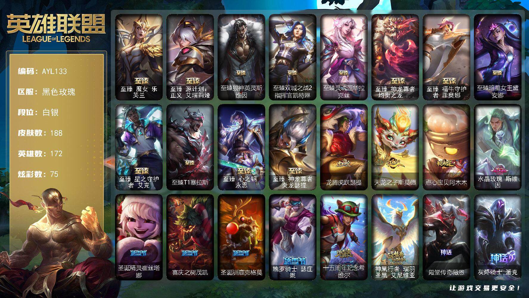 [15144708]白银段位-172英雄-188皮肤-75炫彩-0终极-16神话-23限定-34传说-25史诗 【热门头像】:觅心之翼奎因头像 【至臻皮肤】:至臻魔女乐芙兰,至臻源计划正义艾瑞莉娅,至臻狼神英灵斯维因,至臻双城之战2指挥官凯特琳,至臻灵魂莲华拉克丝,至臻神龙尊者均衡之龙沃利贝尔,至臻福牛守护者菲奥娜,至臻暗星女王黛安娜,至臻星之守护者艾克,至臻T1塞拉斯,至臻心之钢永恩,至臻神龙尊者炎龙瑟提 【臻彩皮肤】:无畏骑士瑟庄妮赤子初心,冠军之箭艾希凯旋圣装,霸天异形卡兹克掠空魅影,西部魔影卢锡安贝利尔之怠,霸天异形卡兹克刹那银光,星之守护者卡莎热情之光,可爱可爱粉红红布里茨,魔女阿卡丽虚荣 【年限皮肤】:龙腾虎跃瑟提,天龙之子斯莫德,点心宝贝阿木木 【情人节限定】:水晶玫瑰斯维因 【冰雪限定】:圣诞精灵崔丝塔娜,喜庆之树茂凯,圣诞驯鹿克格莫,魄罗骑士瑟庄妮 【神话皮肤】:十五周年纪念希维尔,神凰行者瑞羽圣凰艾尼维亚,殿堂传奇薇恩,灰烬骑士派克,至臻福牛守护者菲奥娜,至臻魔女乐芙兰,至臻神龙尊者均衡之龙沃利贝尔,至臻神龙尊者炎龙瑟提,至臻星之守护者艾克,至臻心之钢永恩,至臻源计划正义艾瑞莉娅 【限定皮肤】:Fnatic古拉加斯,Fnatic迦娜,女帝格温,暗裔英雄盖伦,胜利之运崔斯特,胜利女神菲奥娜,鬼影重重魔腾,无头骑士赫卡里姆,魅惑女巫崔丝塔娜,糖果使徒费德提克,密林猎手提莫,征服者贾克斯,防暴士兵辛吉德,海之歌奈德丽,双城之战2微光实验室辛吉德 【传说皮肤】:战地机甲厄加特,血石领主弗拉基米尔,战场女武神凯尔,日蚀骑士希维尔,驯龙炮手崔丝塔娜,合金巨兽努努和威朗普,女皇艾希,西部天使艾希,律政大亨蒙多,电玩女神娑娜,红色男爵库奇,女帝卡特琳娜,神龙尊者圣龙李青,源计划净化薇恩,驯龙学者黑默丁格,炼狱魔犬内瑟斯,青花瓷伊泽瑞尔,腥红之月鬼武姬阿卡丽,神王盖伦,黎明使者锐雯,枯萎之壤泽拉斯,焰尾妖狐阿狸,偶像歌手阿狸,宇航员诺提勒斯,霸天异形卡兹克,神王德莱厄斯,黑夜使者亚索,暗星尊烬,西部魔影卢锡安,天煞劫,海魔至尊亚托克斯,灵魂莲华锤石,源计划毁灭派克,灵魂莲华瑟提 【史诗皮肤】:战争机器赛恩,钢铁之心希维尔,兔宝宝提莫,荒野豺狼沃里克,五杀摇滚键盘手娑娜,恐惧新星普朗克,绝代智将斯维因,沙漠风暴卡特琳娜,枯萎之壤雷克顿,暗星嘉文四世,三昧真火孙悟空,斗战胜佛孙悟空,苍