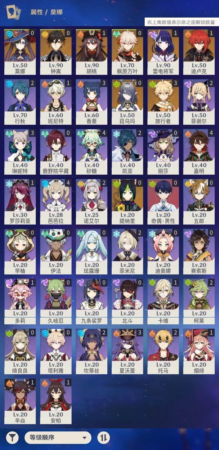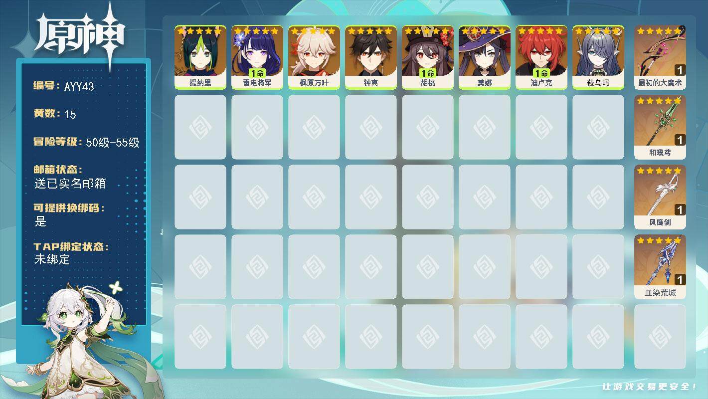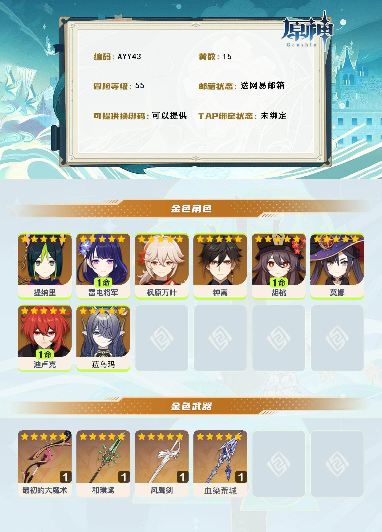 [15145017]55级/15黄/男主/8个五星角色/4个五星武器 0命提纳里,1命雷电将军,0命枫原万叶,0命钟离,1命胡桃,0命莫娜,1命迪卢克,0命菈乌玛,精1最初的大魔术,精1和璞鸢,精1风鹰剑,精1血染荒城