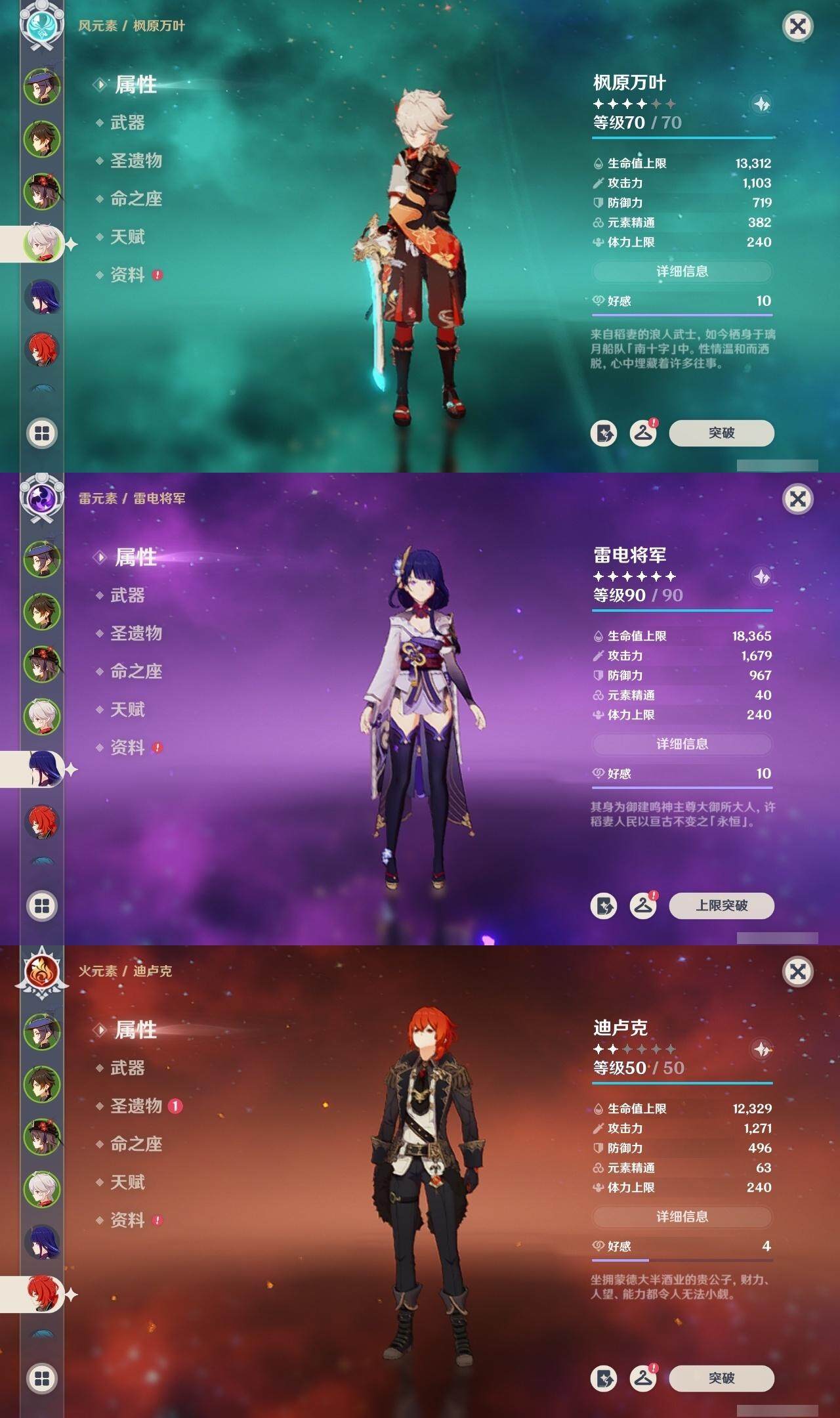 0命提纳里,1命雷电将军,0命枫原万叶,0命钟离,1命胡桃,0命莫娜,1命迪卢克,0命菈乌玛,精1最初的大魔术,精1和璞鸢,精1风鹰剑,精1血染荒城