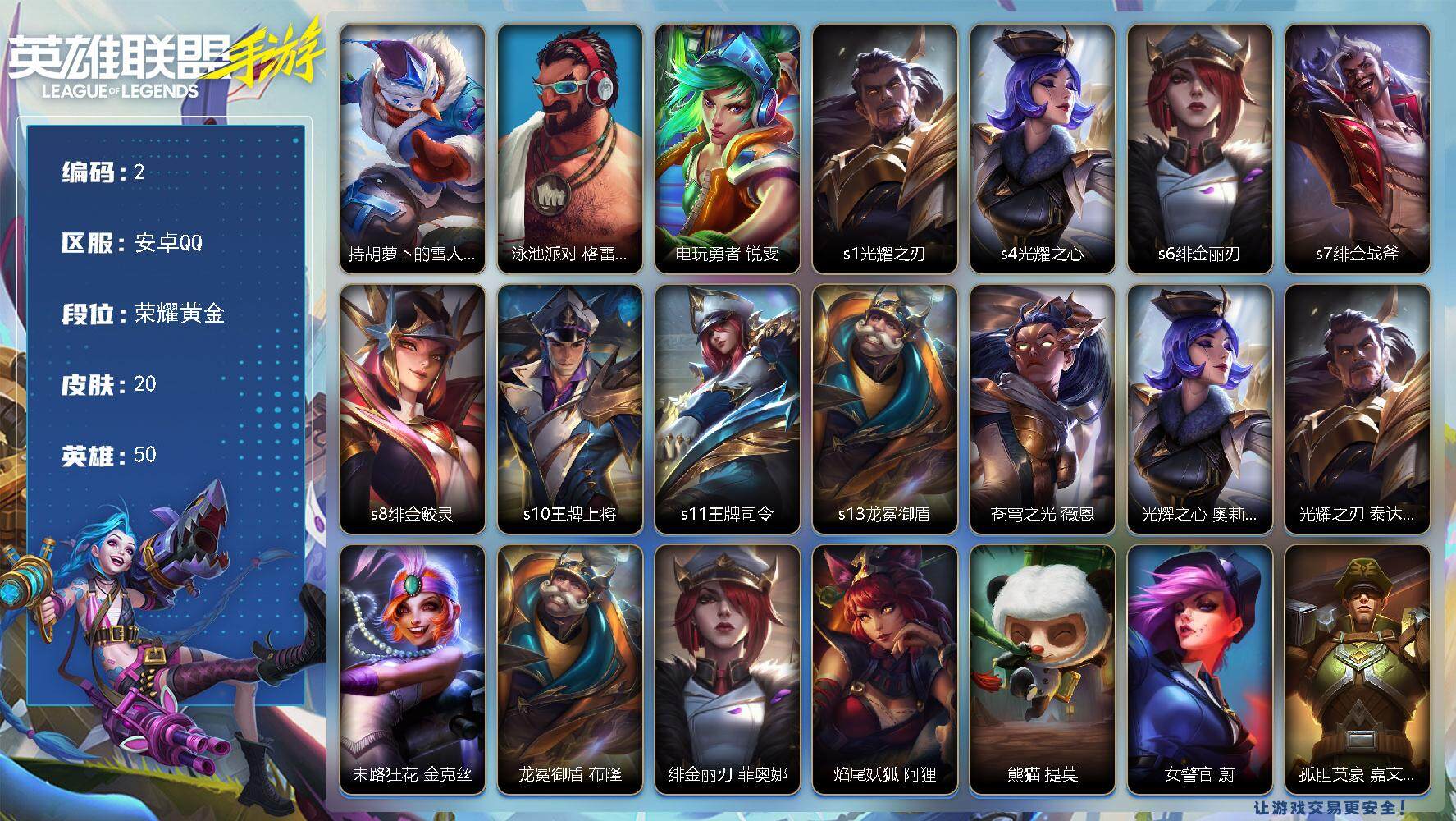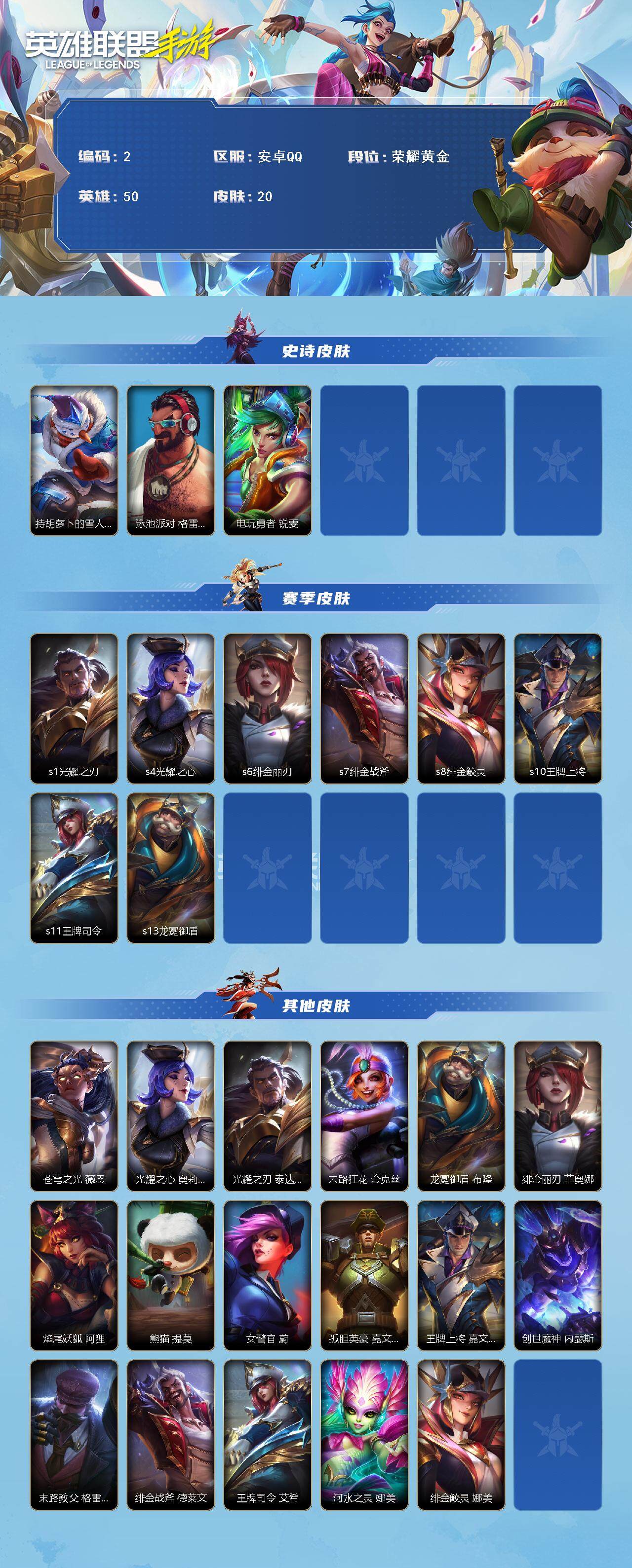 [15145090]50英雄-20皮肤 【史诗皮肤】:持胡萝卜的雪人 易,泳池派对 格雷福斯,电玩勇者 锐雯 【赛季皮肤】:s1光耀之刃,s4光耀之心,s6绯金丽刃,s7绯金战斧,s8绯金鮫灵,s10王牌上将,s11王牌司令,s13龙冕御盾 【其他皮肤】:苍穹之光 薇恩,光耀之心 奥莉安娜,光耀之刃 泰达米尔,末路狂花 金克丝,龙冕御盾 布隆,绯金丽刃 菲奥娜,焰尾妖狐 阿狸,熊猫 提莫,女警官 蔚,孤胆英豪 嘉文四世,王牌上将 嘉文四世,创世魔神 内瑟斯,末路教父 格雷福斯,绯金战斧 德莱文,王牌司令 艾希,河水之灵 娜美,绯金鲛灵 娜美