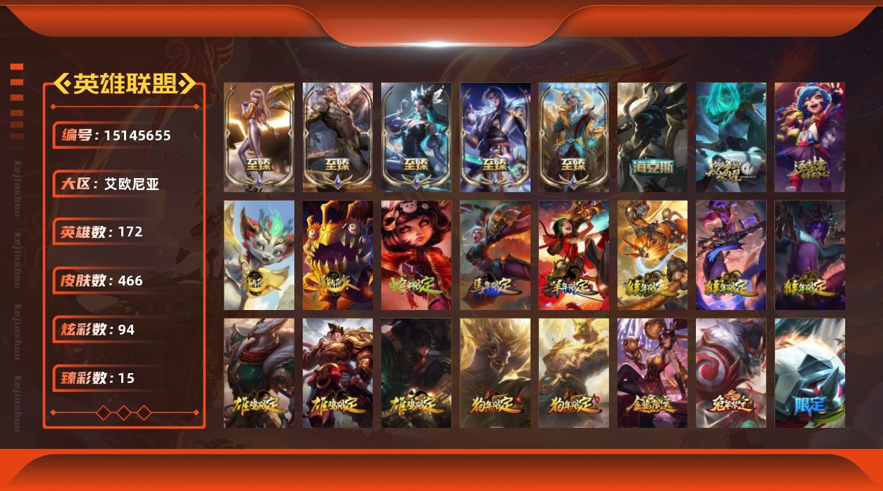 [15145655]黄金段位-172英雄-466皮肤-94炫彩-0终极-9神话-81限定-41传说-112史诗-艾欧尼亚-QQ皇冠号