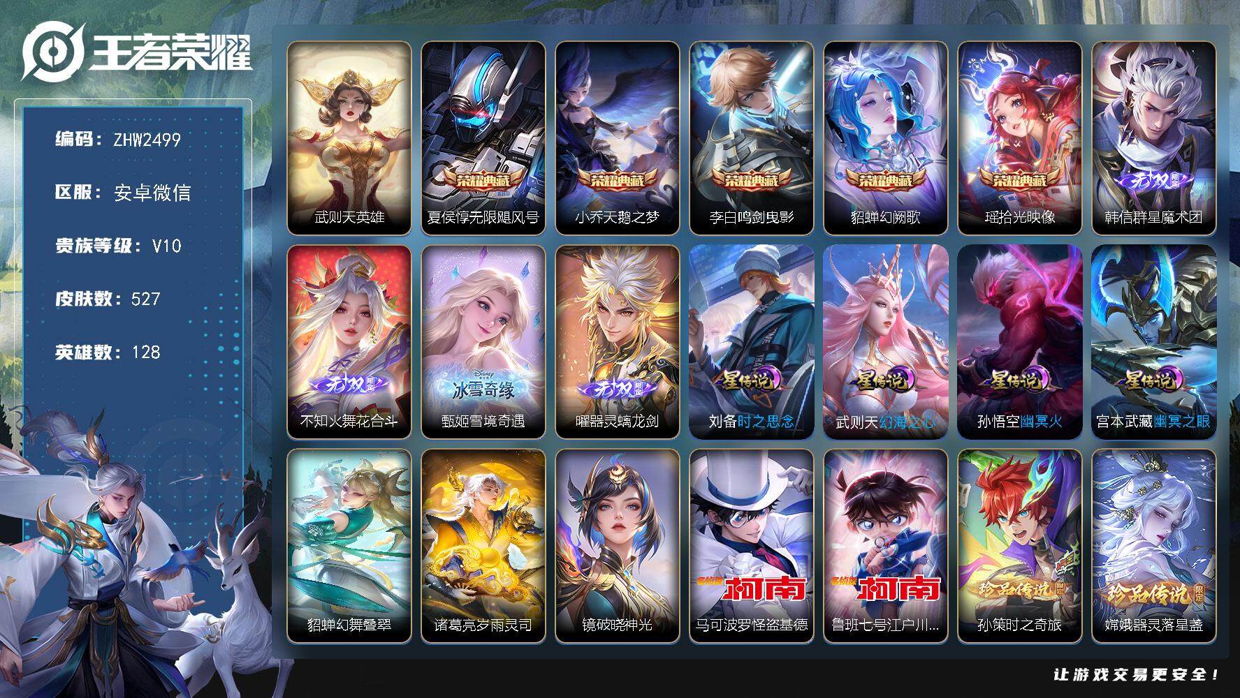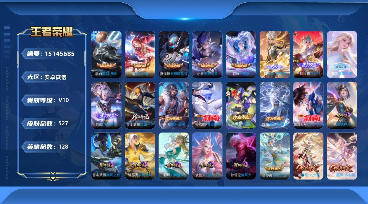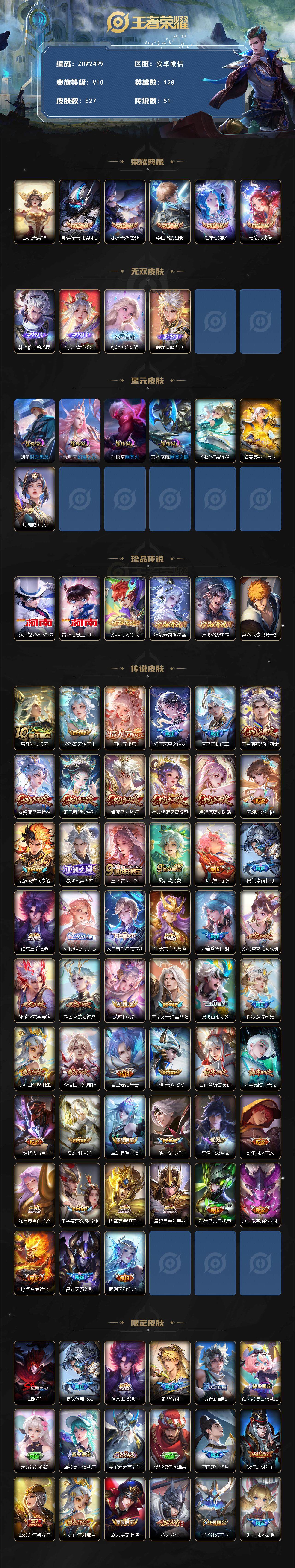 [15145685]安卓WX-V10-尊贵铂金IV段位-128英雄-527皮肤-5典藏皮肤-1典藏英雄-7星元-4无双-6珍品传说-51传说-178史诗