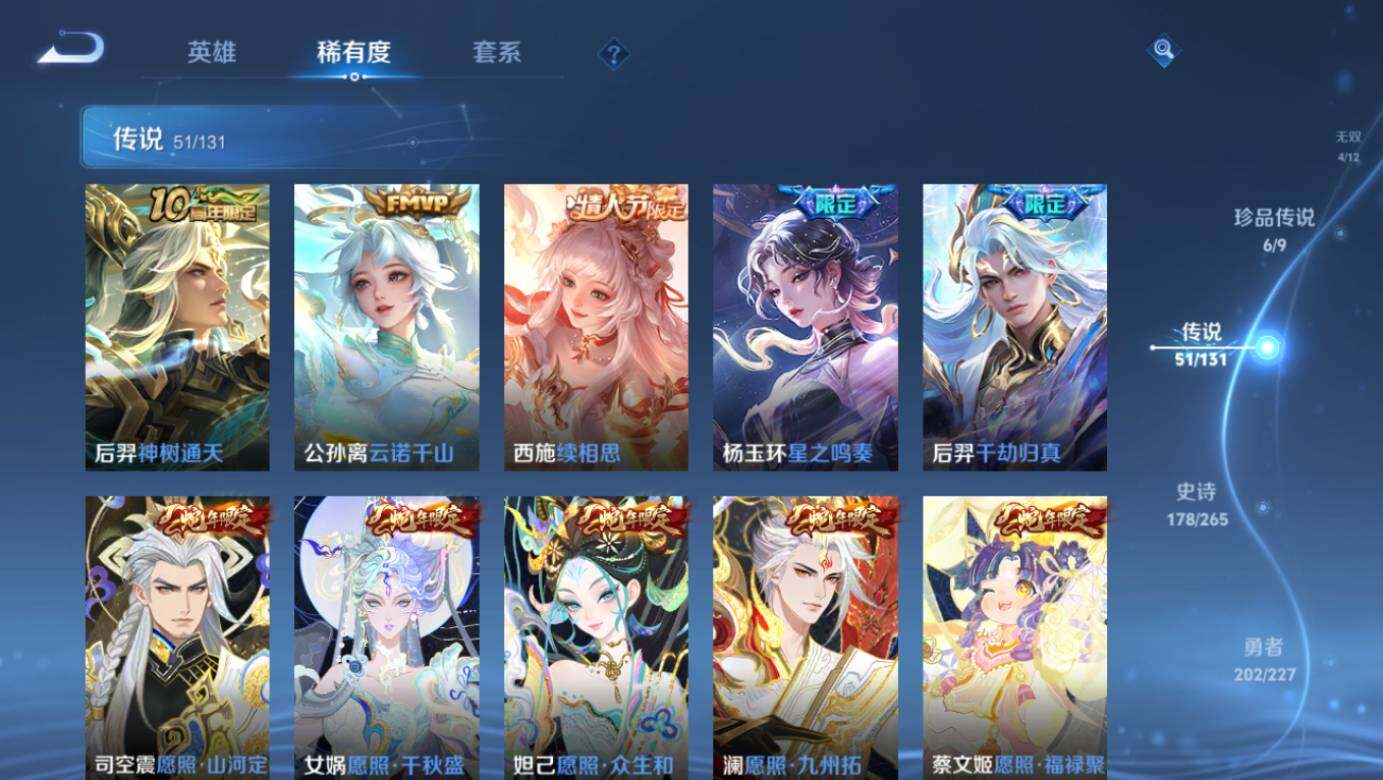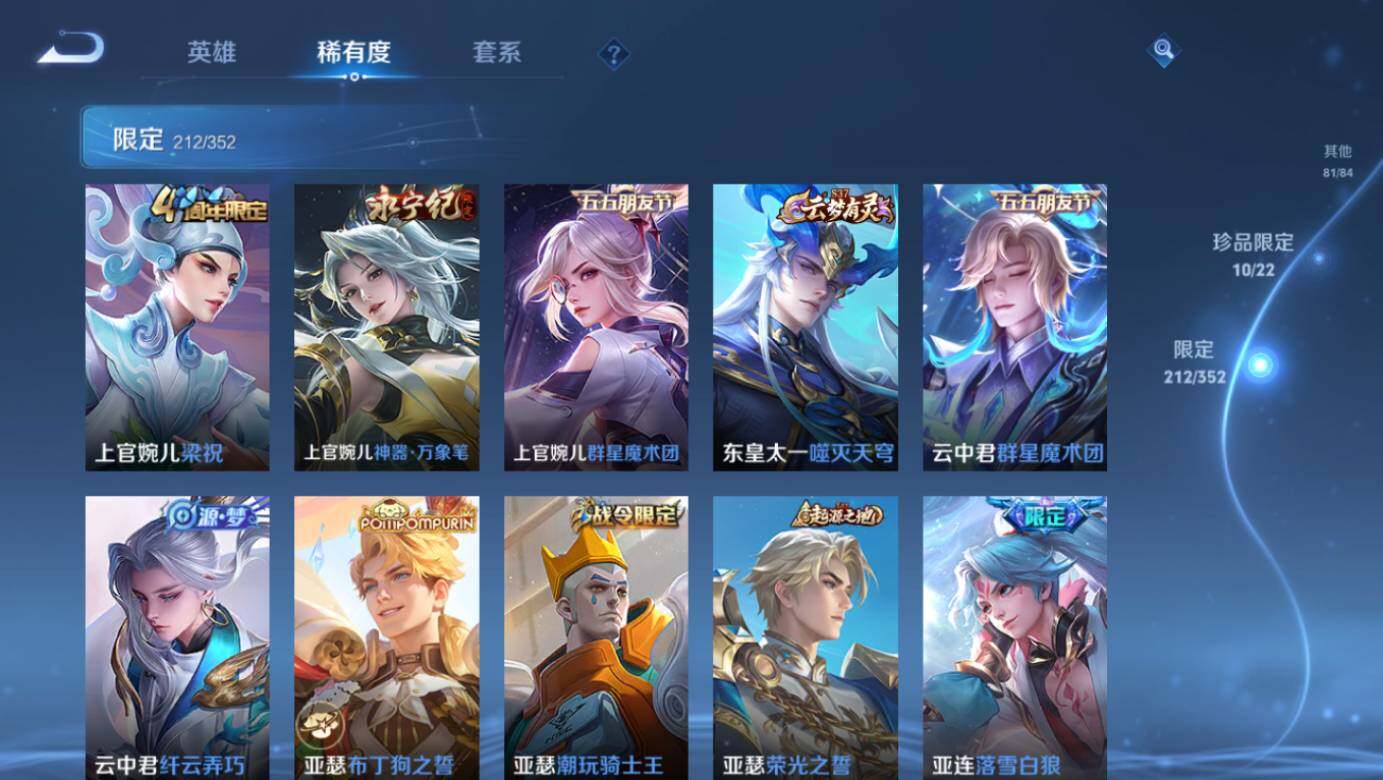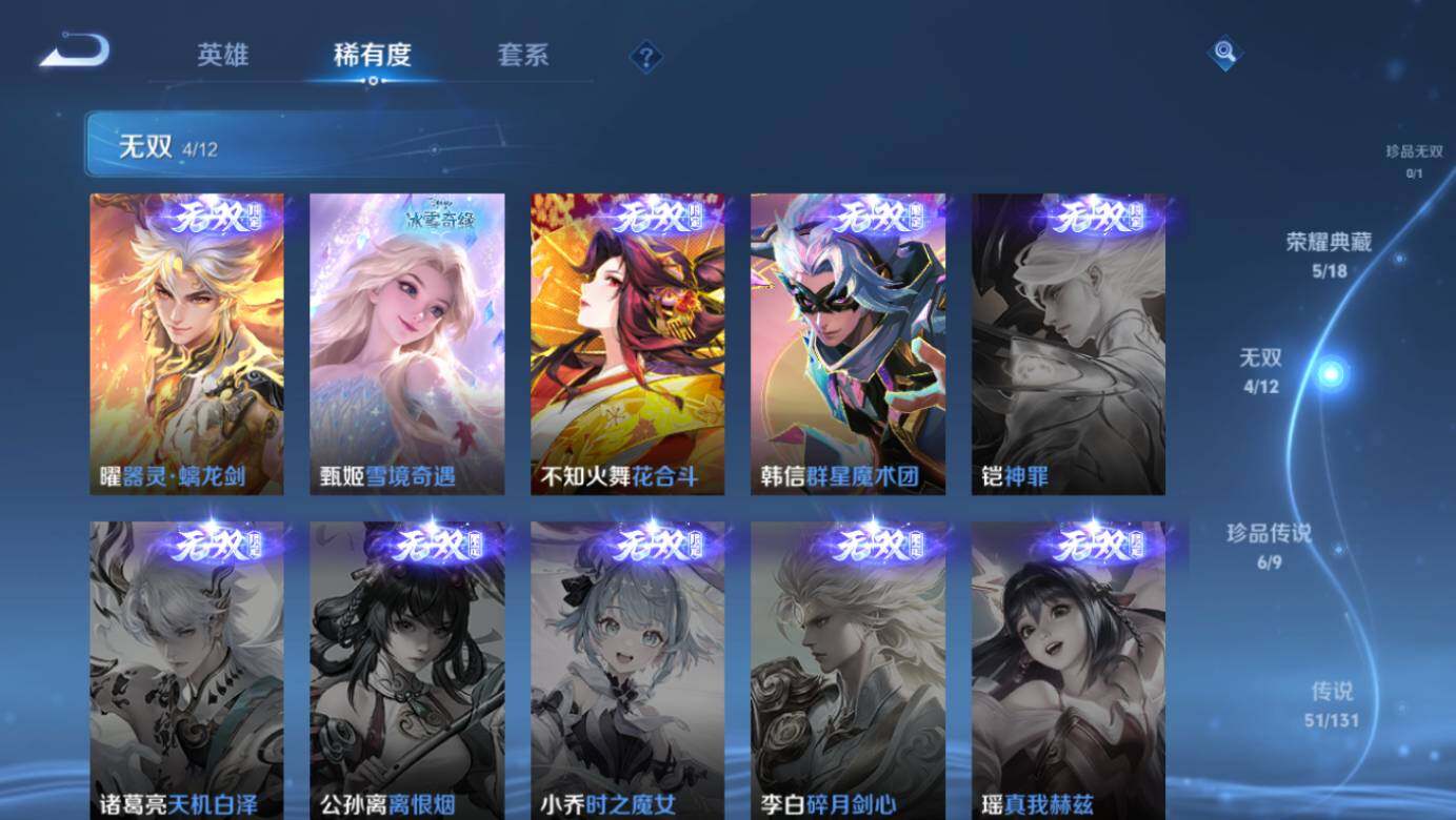 关羽冰锋战神,裴擒虎李小龙,上官婉儿梁祝,牛魔奔雷神使,公孙离祈雪灵祝,吕布御风骁将,诸葛亮时雨天司,赵云龙胆,黄忠烈魂,后羿辉光之辰,典韦岱宗,孙膑天狼运算者,马可波罗逐梦之星,韩信逐梦之影,王昭君凤凰于飞,项羽霸王别姬,虞姬霸王别姬,孙悟空大圣娶亲,花木兰默契交锋,孙悟空至尊宝,干将莫邪冰霜恋舞曲,妲己时之彼端,芈月白晶晶,安琪拉魔法小厨娘,猪八戒猪悟能,孙悟空孙行者,甄姬女儿国国王,公孙离玉兔公主,金蝉唐三藏,上官婉儿神器·万象笔,盾山梦圆繁星,盘古冰霜神祇,瑶山海·碧波行,西施至美·乘鲤谣,夏侯惇霜北刀,桑启鸣野蒿,艾琳陌上桑,王昭君映山客,澜愿照·九州拓,蔡文姬愿照·福禄聚,虞姬愿照·岁时盈,司空震愿照·山河定,妲己愿照·众生和,女娲愿照·千秋盛