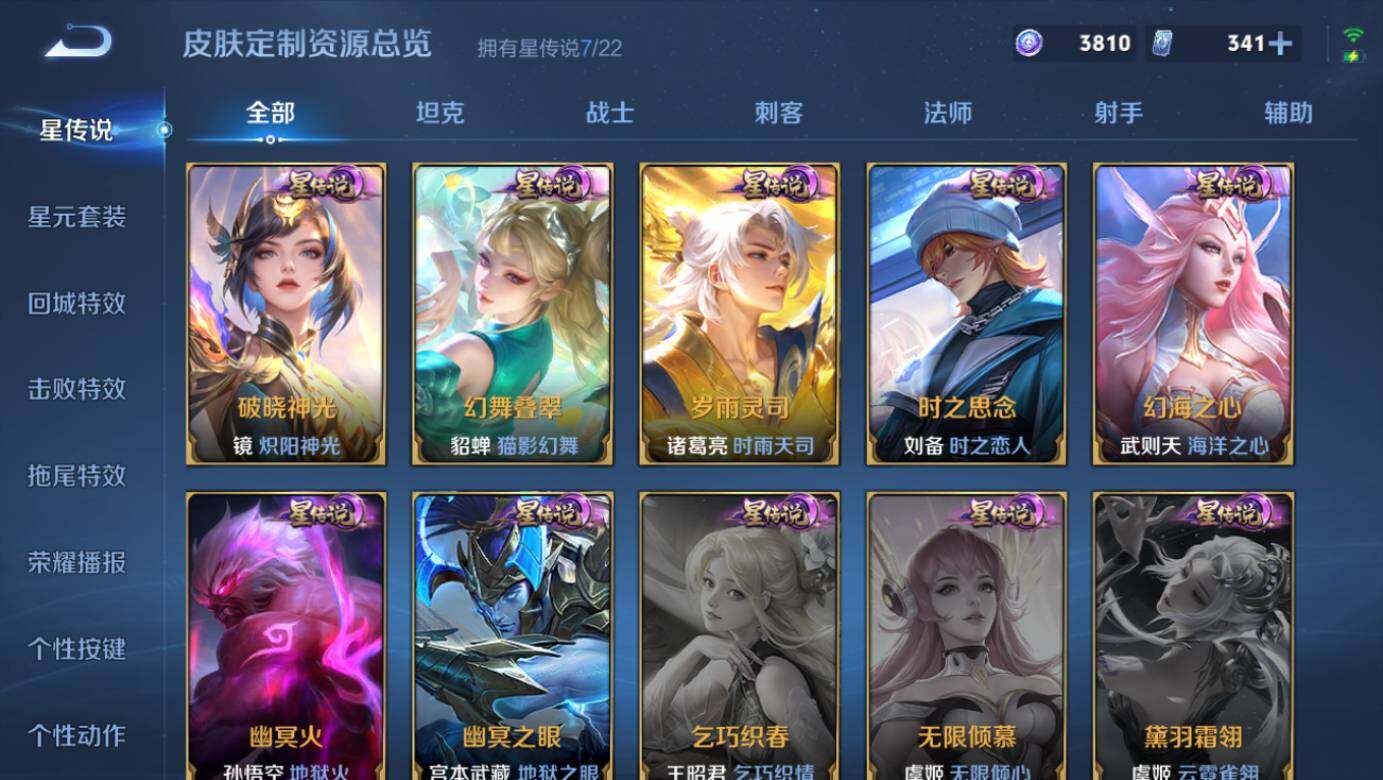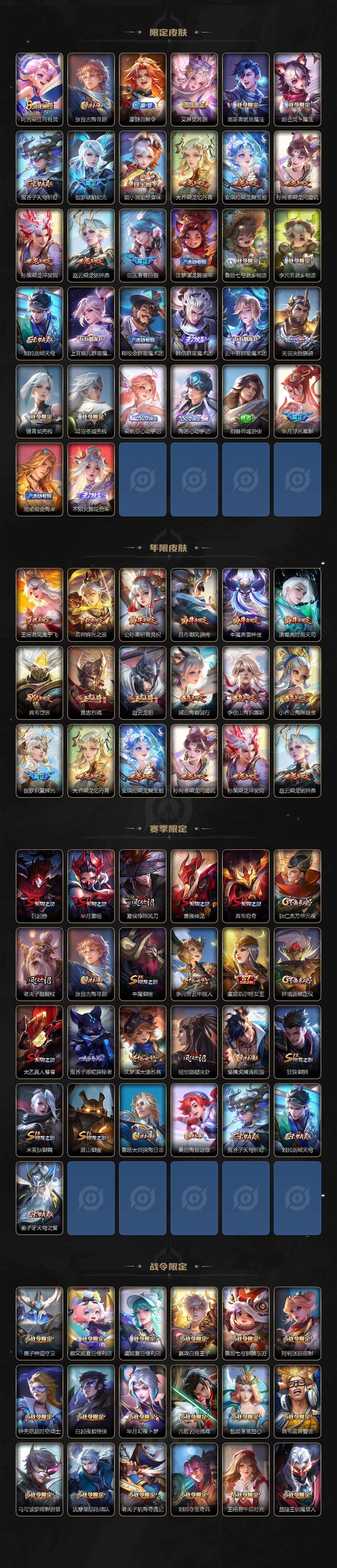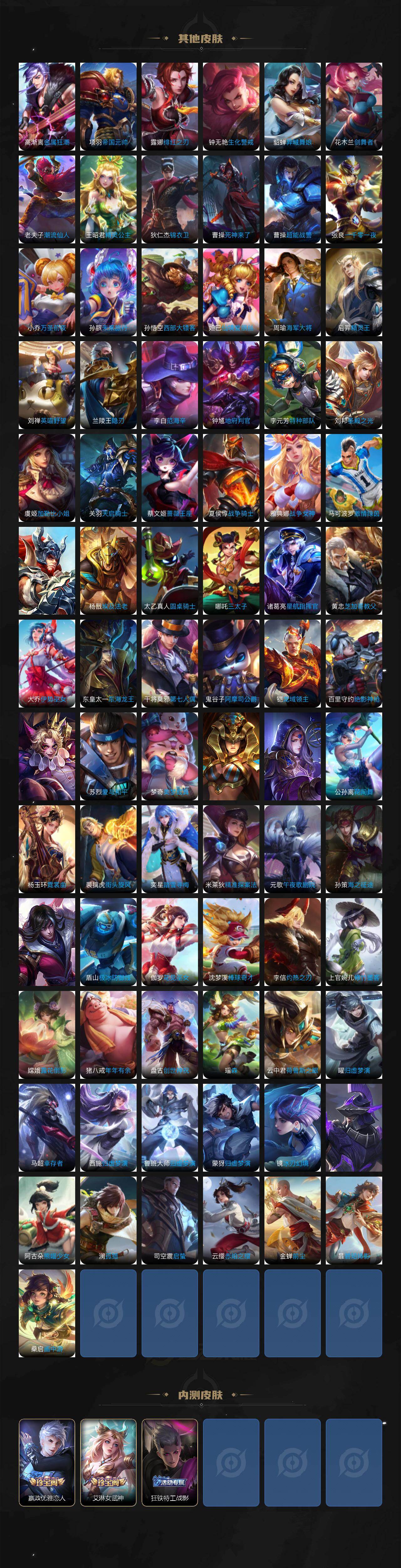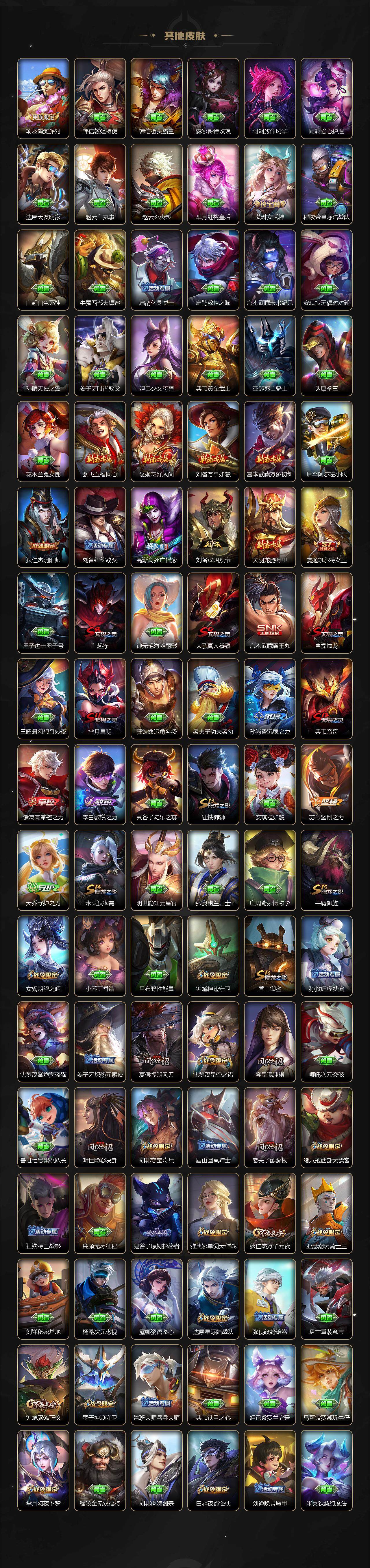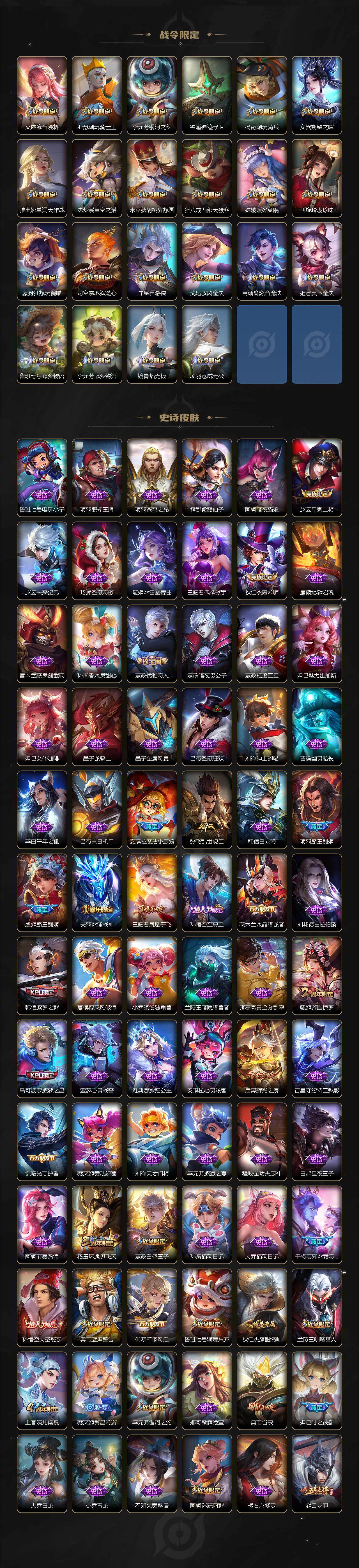 虞姬凯尔特女王,白起狰,太乙真人饕餮,曹操烛龙,芈月重明,典韦穷奇,狂铁御狮,米莱狄御霄,牛魔御旌,盾山御銮,夏侯惇朔风刀,明世隐疑决卦,老夫子醍醐杖,鬼谷子原初探秘者,狄仁杰万华元夜,钟馗驱傩正仪,嬴政白昼王子,女娲朔望之晖,典韦蓝屏警告,钟馗神迹守卫,鲁班七号狮舞东方,沈梦溪星空之诺,李元芳银河之约,刘邦夺宝奇兵,马可波罗暗影游猎,蒙犽狂想玩偶喵,元歌云间偶戏,弈星混沌棋,沈梦溪大漠名商,李元芳云中旅人,桑启海盐诗旅,裴擒虎擒涛扼浪,鲁班大师探海日志,张良古海寻踪,项羽苍威无极,镜青焰无极