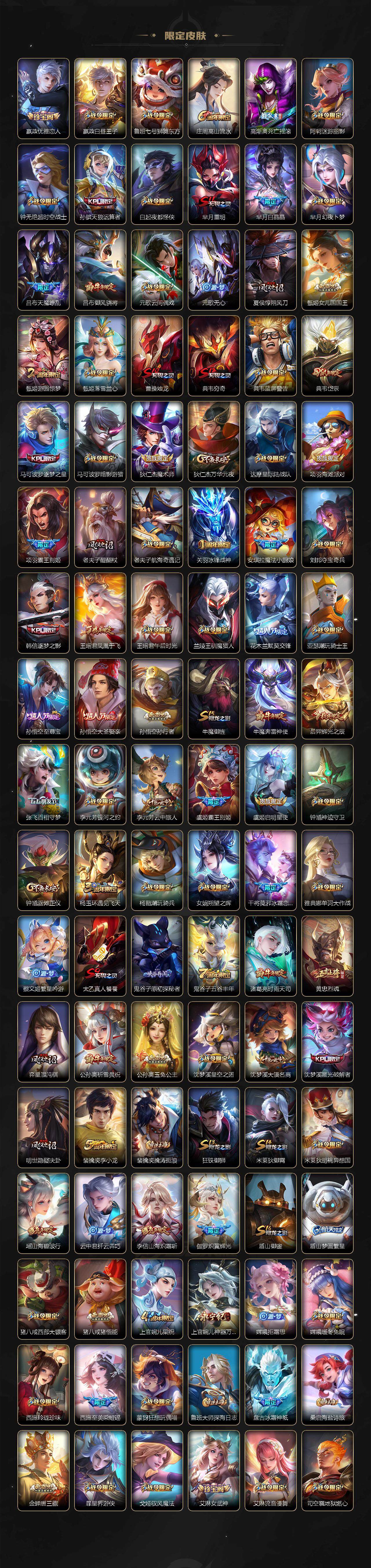 【限定皮肤】:白起狰,夏侯惇霜北刀,铠冥王哈迪斯,暃埋骨钱,蒙犽顽岩魄,蔡文姬夏日便利店,大乔绒语心约,虞姬夏日便利店,姜子牙天穹之誓,杨戬破阵退雄兵,李白谪仙醉月,狄仁杰阴阳师,虞姬凯尔特女王,小乔山海琳琅生,赵云皇家上将,赵云龙胆,墨子神迹守卫,妲己时之彼端,嬴政优雅恋人,嬴政白昼王子,鲁班七号狮舞东方,庄周高山流水,高渐离死亡摇滚,阿轲迷踪丽影,钟无艳超时空战士,孙膑天狼运算者,白起夜都怪侠,芈月重明,芈月白晶晶,芈月幻夜卜梦,吕布天魔缭乱,吕布御风骁将,元歌云间偶戏,元歌无心,夏侯惇朔风刀,甄姬女儿国国王,甄姬游园惊梦,甄姬落雪兰心,曹操烛