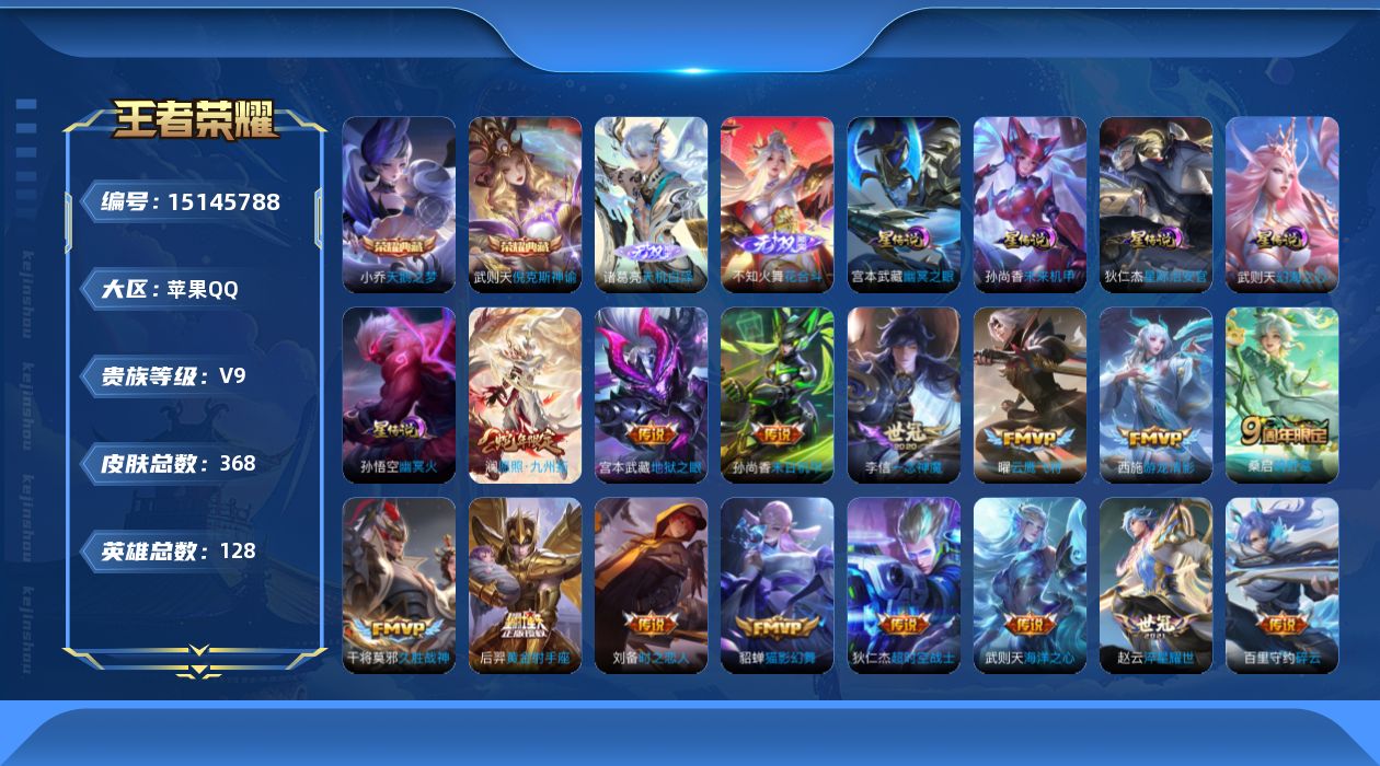 [15145788]【店主推荐捡漏号!可直接换绑】中路30段,苹果Q-V9-最强王者段位-128英雄-368皮肤-2典藏皮肤-1典藏英雄-2无双-5星传说-22传说-99史诗