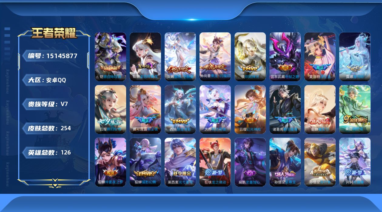 [15145877]可二次实名【店主推荐捡漏号!可直接换绑】安卓Q-V7-最强王者段位-126英雄-254皮肤-1典藏皮肤-16传说-75史诗