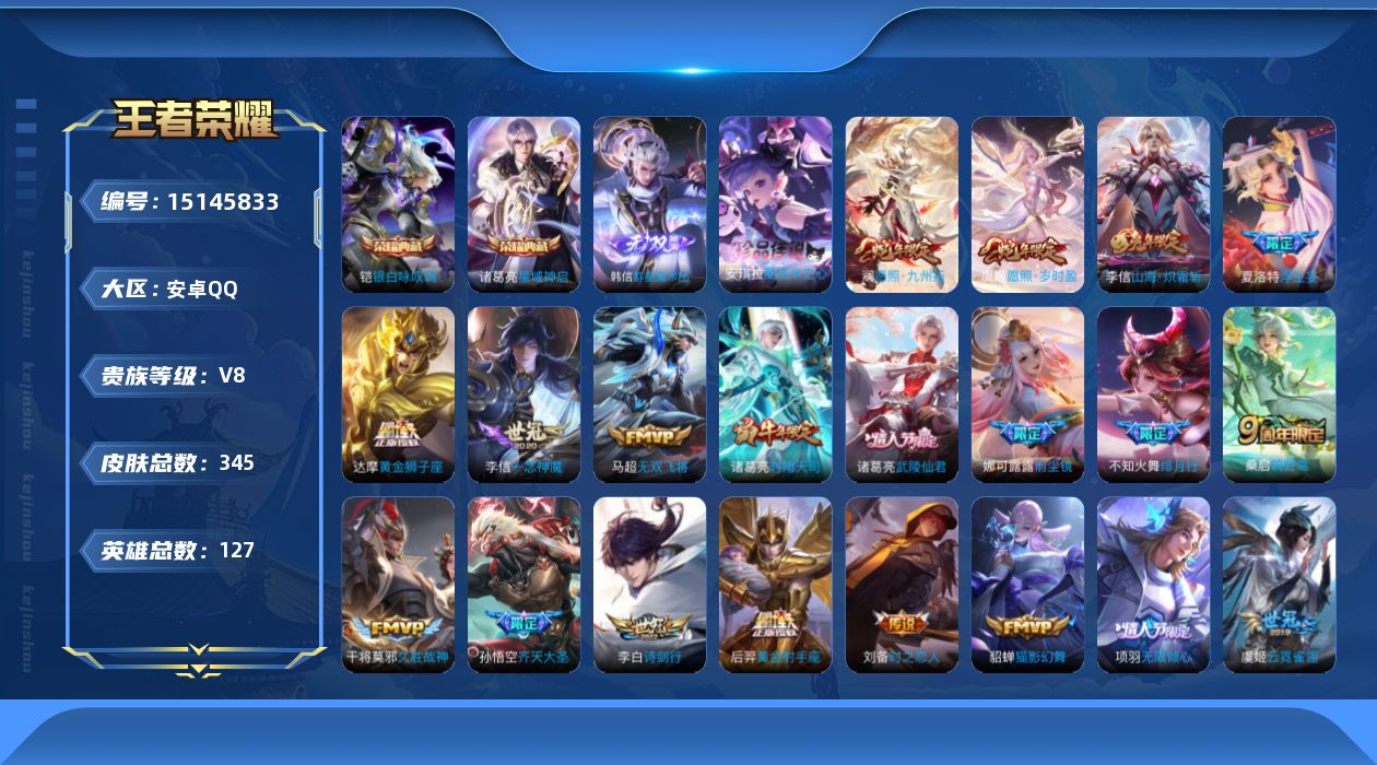 [15145833]可二次【店主推荐捡漏号!可直接换绑】安卓Q-V8-最强王者段位-127英雄-345皮肤-2典藏皮肤-1无双-1珍品传说-22传说-95史诗