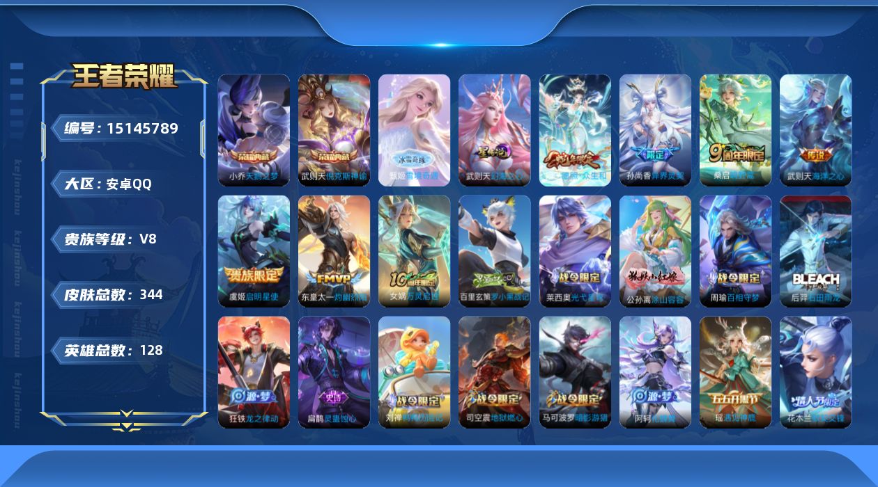 - [11602977]V8 1典藏 1珍品传说 23传说 124英雄 287皮肤 可修改实名 优质装备:弑枪猎影(韩信典藏),黑崎一护,黄金狮子座,云鹰飞将(小将军),炽阳神光,一念神魔,地狱火,地狱之眼,无双飞将,山海·炽霜斩(李信年限),山海·苍雷引(电光曜子),惊梅引 传说皮:乘龙·铭钟鼎(赵云年限),典韦战鼓燎原 珍宝阁皮:优雅恋人,蔷薇恋人,玩趣恶龙 限定皮:愿照·九州拓(澜年限),愿照·山河定(司空震年限),鸣野蒿,至尊宝,傲雪梅枪,时雨天司(水龙头),飞衡(韩信年限),影龙天霄,高山流水,诗剑行,齐天大圣,怒海麟威,五谷丰年,青龙志(铠年限),梁祝,岱宗(典韦年限),李小龙,孙行者,大圣娶亲,引擎之心,寅虎·赤拳(老虎年限),深海之息(深海大菠萝),山海·玄木吟(马可年限) 史诗皮:器灵·浮梦炉,星界战将,龙之律动,石田雨龙,茶境仙,怒海争锋,破空之剑,百相守梦-百里守约,百相守梦-黄忠,紫霞仙子,黄金分割率,特工魅影,千年之狐,江河有灵,百解令(蒙犽),蒙恬荣光圣徽,匿光破解者,偶像歌手,电玩·爆裂旋风,百相守梦(刘备),龙骑士(小龙虾),猫狗日记-孙策,乱世虎臣,节奏热浪,修罗,女仆咖啡,摇滚巨星,水果甜心,星夜王子,功夫厨神,德古拉伯爵,暗隐猎兽者,幽灵船长,鬼剑武藏,暗渊魔法,心灵战警,舞动绿茵,地狱岩魂,拒霜思,乘风破浪,水晶猎龙者,热力回旋,金属风暴,原初追逐者,圣诞恋歌,鹰眼统帅,魅力维加斯,赏金猎手,无心,未来纪元-赵云