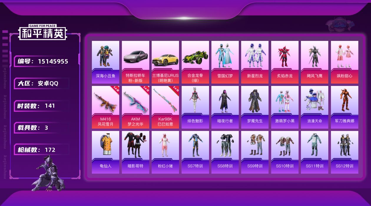 [15145955]可二次【店主推荐捡漏号!可直接换绑】安卓 手Q-5粉装-3特效枪-3载具-2粉色飞行器-54435热力值-10王牌印记-141套装-172枪皮【热门品类】:粉装-雪国幻梦,套装-浪漫天命,套装-深海小丑鱼,角色-军刀雅典娜,套装-暗夜行者,套装-龟仙人,套装-暗影哥特,套装-粉红小猪【粉色载具】:特斯拉Roadster(沁心粉),兰博基尼URUS(明艳黄),合金龙骨(绿)【粉色套装】:粉装-雪国幻梦,粉装-新星烈龙,粉装-炙焰赤龙,粉装-飓风飞鹰,粉装-飒粉甜心【粉色枪皮等级】:AKM-梦之光华(五级),M416-风花雪月(六级),Kar98K-巳巳如意(五级)【粉色枪皮】:AKM-梦之光华,M416-风花雪月,Kar98K-巳巳如意