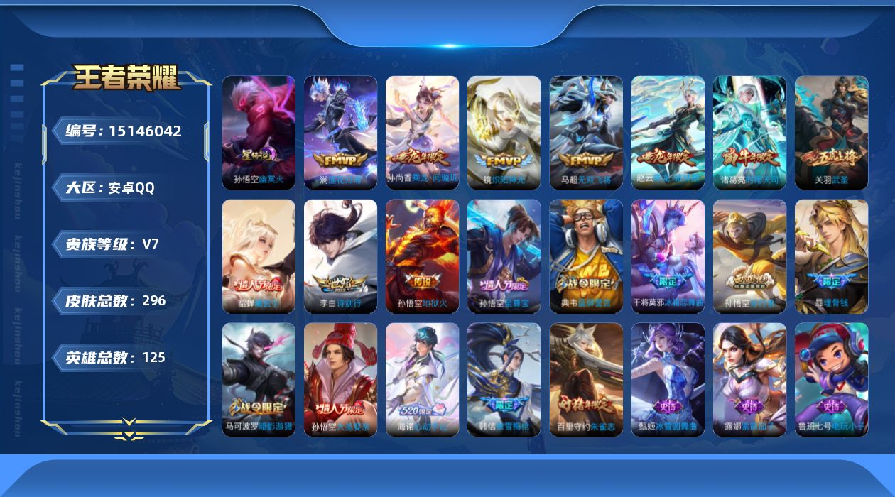 - PX_2093290-84 安卓QQ/至尊星耀/175皮肤/121英雄/1典藏/0珍品无双/1无双/3珍品传说/10传说/57史诗/5稀有英雄 【3 珍品传说】大耳狗之梦 瑶,器灵·落星盏 嫦娥,兔狲·蓬尾 张飞, 【1 典藏皮肤】神鉴启示录 虞姬, 【1 无双皮肤】器灵·螭龙剑 曜, 【10 传说皮肤】灼幽烈阳 东皇太一,惊梅引 宫本武藏,鹤羽星尊 诸葛亮,炽阳神光 镜,山海·炽霜斩 李信,山海