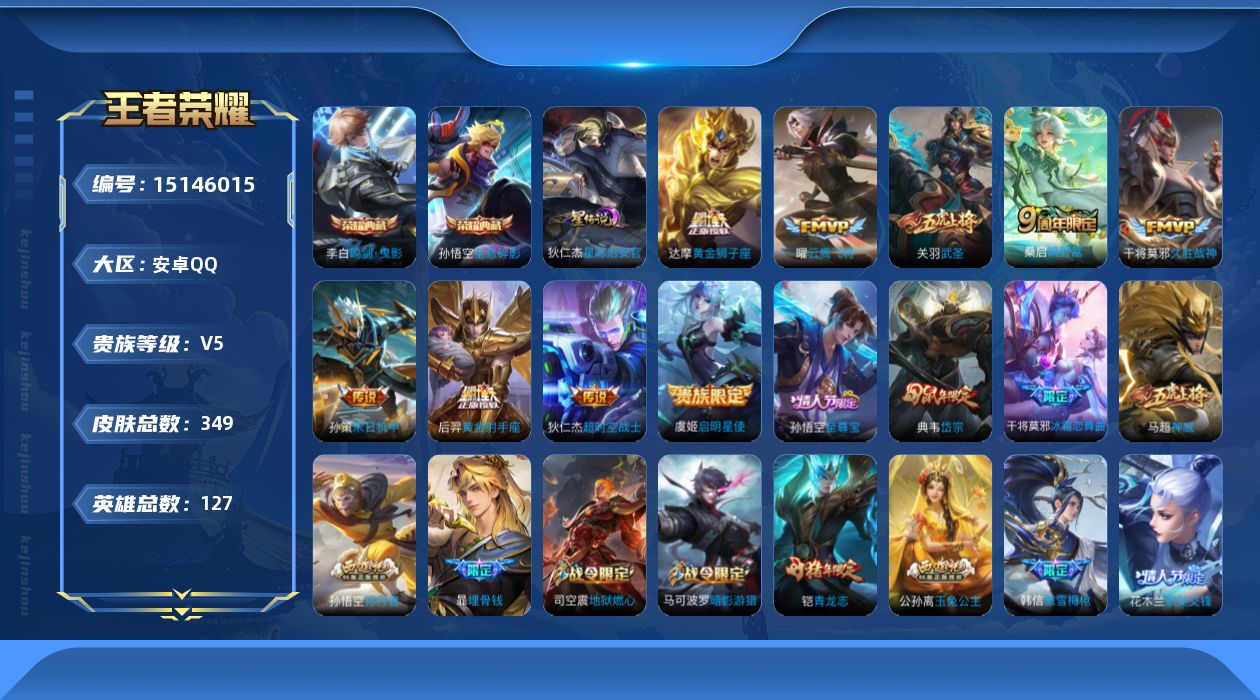 - [13979810]【店主推荐捡漏号!可直接换绑】安卓Q-V8-最强王者段位-127英雄-368皮肤-2典藏-13传说-103史诗 【英雄全皮】:猪八戒全皮,蒙恬全皮,戈娅全皮 【荣耀典藏】:李白鸣剑曳影,诸葛亮星域神启 【传说皮肤】:云缨幻光神枪,桑启鸣野蒿,李信山海炽霜斩,马超无双飞将,孙尚香异界灵契,虞姬启明星使,貂蝉猫影幻舞,虞姬云霓雀翎,李白凤求凰,孙尚香末日机甲,宫本武藏地狱之眼,孙悟空地狱火,狄仁杰超时空战士 【限定皮肤】:白起狰,姜子牙天穹之誓,狄仁杰阴阳师,虞姬凯尔特女王,赵云皇家上将,墨子神迹守卫,嬴政白昼王子,孙尚香蔷薇恋人,孙尚香异界灵契,鲁班七号狮舞东方,庄周高山流水,高渐离死亡摇滚,钟无艳王者之锤,孙膑妖精王,扁鹊炼金王,白起夜都怪侠,芈月重明,芈月幻夜卜梦,吕布猎兽之王,周瑜赤莲之焰,元歌云间偶戏,元歌无心,夏侯惇朔风刀,甄姬游园惊梦,曹操烛龙,典韦穷奇,典韦蓝屏警告,马可波罗暗影游猎,狄仁杰魔术师,狄仁杰万华元夜,达摩星际陆战队,达摩沙漠行僧,项羽海滩派对,老夫子醍醐杖,老夫子航海奇遇记,程咬金演武夺筹,韩信逐梦之影,韩信飞衡,王昭君凤凰于飞,兰陵王驯魔猎人,兰陵王金庭之子,亚瑟潮玩骑士王,孙悟空美猴王,孙悟空至尊宝,孙悟空孙行者,牛魔御旌,后羿圣弓游侠,李元芳银河之约,李元芳云中旅人,虞姬启明星使,钟馗神迹守卫,钟馗驱傩正仪,杨玉环遇见飞天,女娲朔望之晖,干将莫邪冰霜恋舞曲,干将莫邪胡桃夹子,干将莫邪真爱魔法,雅典娜单词大作战,雅典娜黎明之约,蔡文姬繁星吟游,太乙真人饕餮,鬼谷子原初探秘者,鬼谷子五谷丰年,黄忠烈魂,黄忠火炮绅士,苏烈千军破阵,百里玄策原初追逐者,百里守约朱雀志,弈星混沌棋,梦奇顽趣,沈梦溪星空之诺,沈梦溪大漠名商,明世隐疑决卦,明世隐吟游魔法,裴擒虎天狼狩猎者,裴擒虎李小龙,裴擒虎擒涛扼浪,狂铁御狮,米莱狄御霄,米莱狄胡桃异想国,云中君纤云弄巧,李信山海炽霜斩,伽罗天狼溯光者,盾山御銮,猪八戒西部大镖客,猪八戒猪悟能,上官婉儿梁祝,嫦娥拒霜思,西施玲珑珍味,蒙犽狂想玩偶喵,鲁班大师探海日志,桑启海盐诗旅,戈娅驭风魔法,艾琳女武神,艾琳流音漫舞,司空震地狱燃心,阿古朵江河有灵,张良古海寻踪,蒙犽百解令,蒙恬荣光圣徽,高渐离燃音魔法,妲己灵卜魔法,鬼谷子天穹祈灯,安琪拉乘龙聚宝船,沈梦溪龙舞盛年,刘邦剑破天穹,程咬金群星魔术团,周瑜熔金