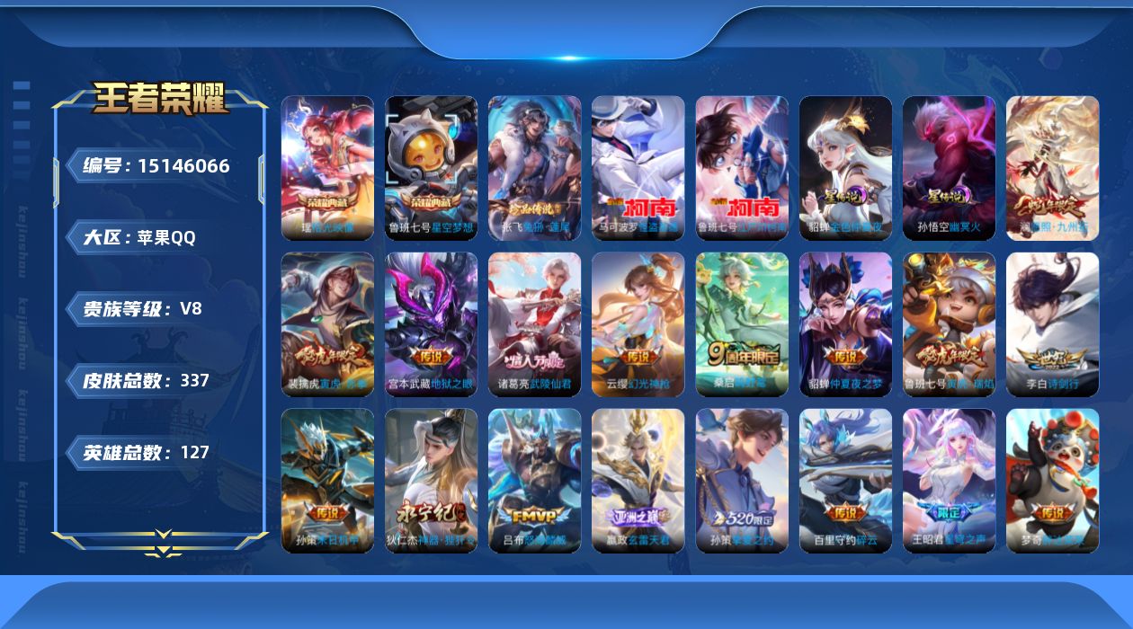[15146066]可二次【店主推荐捡漏号!可直接换绑,,发育路29段,,】苹果Q-V8-最强王者段位-127英雄-337皮肤-2典藏皮肤-3珍品传说-2星传说-20传说-107史诗 【英雄全皮】:阿轲全皮,蒙恬全皮,影全皮 【荣耀典藏】:鲁班七号星空梦想,瑶拾光映像 【珍品传说】:马可波罗怪盗基德,鲁班七号江户川柯南,张飞兔狲蓬尾 【传说皮肤】:澜愿照九州拓,云缨幻光神枪,嬴政玄雷天君,桑启鸣野蒿,吕布怒海麟威,李白诗剑行,狄仁杰神器狴犴令,王昭君星穹之声,百里守约碎云,孙策挚爱之约,孙策末日机甲,裴擒虎寅虎赤拳,鲁班七号寅虎瑞焰,虞姬启明星使,虞姬云霓雀翎,梦奇胖达荣荣,诸葛亮武陵仙君,貂蝉仲夏夜之梦,宫本武藏地狱之眼,孙悟空地狱火 【限定皮肤】:白起狰,狄仁杰阴阳师,廉颇寅虎御盾,赵云皇家上将,赵云引擎之心,墨子神迹守卫,墨子降魔,孙尚香蔷薇恋人,鲁班七号狮舞东方,鲁班七号寅虎瑞焰,庄周高山流水,阿轲迷踪丽影,钟无艳超时空战士,孙膑寅虎展翼,芈月幻夜卜梦,元歌云间偶戏,元歌无心,夏侯惇朔风刀,甄姬女儿国国王,甄姬游园惊梦,甄姬落雪兰心,曹操烛龙,典韦穷奇,典韦蓝屏警告,马可波罗暗影游猎,狄仁杰魔术师,狄仁杰万华元夜,狄仁杰神器狴犴令,达摩沙漠行僧,项羽海滩派对,老夫子醍醐杖,老夫子航海奇遇记,程咬金演武夺筹,露娜一生所爱,刘邦夺宝奇兵,韩信逐梦之影,韩信傲雪梅枪,王昭君星穹之声,兰陵王金庭之子,花木兰青春决赛季,亚瑟潮玩骑士王,孙悟空美猴王,孙悟空至尊宝,孙悟空大圣娶亲,孙悟空孙行者,牛魔御旌,后羿圣弓游侠,李元芳云中旅人,虞姬启明星使,钟馗神迹守卫,钟馗驱傩正仪,杨玉环遇见飞天,杨玉环寅虎心曲,女娲朔望之晖,干将莫邪冰霜恋舞曲,干将莫邪真爱魔法,雅典娜单词大作战,雅典娜黎明之约,蔡文姬繁星吟游,太乙真人饕餮,鬼谷子原初探秘者,鬼谷子五谷丰年,诸葛亮武陵仙君,黄忠火炮绅士,苏烈千军破阵,百里玄策原初追逐者,弈星混沌棋,梦奇顽趣,公孙离玉兔公主,沈梦溪大漠名商,明世隐疑决卦,裴擒虎李小龙,裴擒虎寅虎赤拳,裴擒虎擒涛扼浪,狂铁御狮,米莱狄御霄,云中君纤云弄巧,云中君时之祈愿,盾山御銮,孙策挚爱之约,猪八戒西部大镖客,猪八戒猪悟能,上官婉儿梁祝,上官婉儿神器万象笔,嫦娥拒霜思,西施玲珑珍味,蒙犽狂想玩偶喵,鲁班大师探海日志,镜匿光追影者,桑启海盐诗旅,戈娅驭风魔法,艾琳女武神,艾琳流