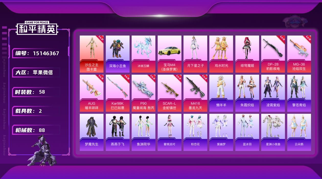 [15146367]社交限制 苹果 微信-1神装图卡盟(二级)-3粉装-7特效枪-2载具-5粉色飞行器-30300热力值-4王牌印记-58套装-88枪皮-微信所有场景限制