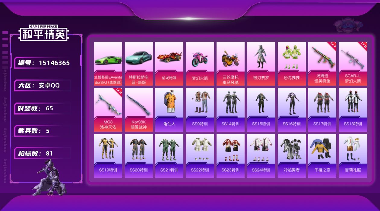 [15146365]可二次【店主推荐捡漏号!可直接换绑】 安卓 手Q-2粉装-4特效枪-5载具-1粉色飞行器-3.4热力值-3王牌印记-65套装-81枪皮【热门品类】:套装-龟仙人【粉色载具】:特斯拉Roadster(水滴蓝),兰博基尼Aventador SVJ(翡翠绿),焰龙咆哮,双人摩托-梦幻火箭,鬼马风驰【粉色套装】:粉装-银刃赛罗,粉装-恐龙拽拽【粉色枪皮等级】:SCAR-L-梦幻火箭(六级),汤姆逊-怪笑疯兔(七级),MG3-洛神天依(二级)【粉色飞行器】:梦幻火箭飞行器
