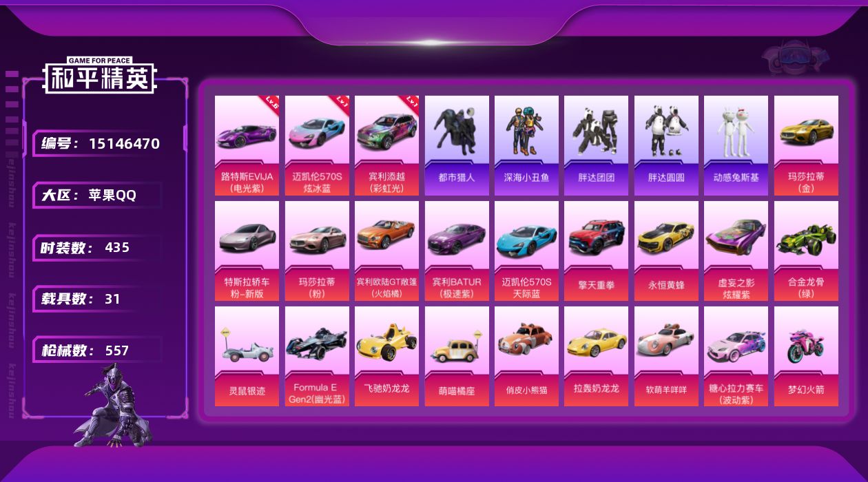 [15146470]不可二次【店主推荐捡漏号!可直接换绑】/素材身法号/路特斯EVIJA(电光紫)(六级)/绝世印记3 苹果 手Q-92粉装-39特效枪-31载具-33粉色飞行器-26.8w热力值-24王牌印记-435套装-557枪皮【红色载具】:路特斯EVIJA(电光紫)(六级),迈凯伦570S(炫冰蓝)(一级),宾利添越(彩虹光)(一级)【热门品类】:粉装-怪诞乔克,粉装-雪国幻梦,粉装-梦幻火箭,粉装-童趣迷兔,粉装-缤纷油彩,绝对防御上衣,套装-浪漫天命,套装-都市猎人,套装-深海小丑鱼,套装-小丑鱼,套装-胖达团团,套装-胖达圆圆,套装-动感兔斯基人偶服,套装-龟仙人,套装-潮萌小黄鸭,套装-浪漫波比,套装-粉红小猪,套装-萌熊伴侣,套装-糯粉咩咩,角色-Mark.06,套装-红熊茄茄【粉色载具】:特斯拉Roadster(沁心粉),路特斯EVIJA(电光紫),玛莎拉蒂Ghibli(金),玛莎拉蒂Ghibli(粉),宾利欧陆GT敞篷(火焰橘),宾利BATUR(极速紫),宾利添越(彩虹光),迈凯伦570S(炫冰蓝),迈凯伦570S(天际蓝),擎天重拳,永恒黄蜂,虚妄之影(炫耀紫),合金龙骨(绿),灵鼠银迹,Formula E Gen2(幽光蓝),飞驰奶龙龙,萌喵橘座,俏皮小熊猫,拉轰奶龙龙,软萌羊咩咩,糖心拉力赛车(波动紫),双人摩托-梦幻火箭,极速兔兔车,拉轰鸭鸭车,僚机-萌兔起飞,僚机-萌酷奶龙,快艇-自由的鲸,快艇-萌酷奶龙,星梦玉骢,黑曜夜骑,辉羽雀灵自行车【粉色套装】:粉装-深海曼妙,粉装-独舞天鹅,粉装-粉色回忆,粉装-怪诞乔克,粉装-甜心巧克力,粉装-宝贝奶油派,粉装-天使彩虹糖,粉装-雪国幻梦,粉装-蝶舞迷情,粉装-精灵迷巫,粉装-梦幻火箭,粉装-缤纷油彩,粉装-放客神游,粉装-甜蜜誓约,粉装-心之恋语,粉装-极致幻想,粉装-星空之魅,粉装-花间之火,粉装-俏皮狐尾,粉装-草莓生巧,粉装-冰霜白皇,粉装-童趣迷兔,粉装-炙焰红王,粉装-香水柠檬,粉装-馨动时刻,粉装-枪炮玫瑰,粉装-蜜桃特工,粉装-蝶舞蔷薇,粉装-暗夜玫瑰,粉装-彩虹鹿灵,粉装-山涧鹿灵,角色-洛天依,粉装-红伞翩翩,粉装-蓝莓炮弹,粉装-绚金瑰梦,粉装-甜心娃娃,粉装-精灵娃娃,粉装-酣梦娃娃,粉装-焦糖拿铁,粉装-薄荷物语,粉装-幻梦音符,粉装-绚丽摇曳,粉装-橘柚倾心,粉装-甜梦小狐,粉装