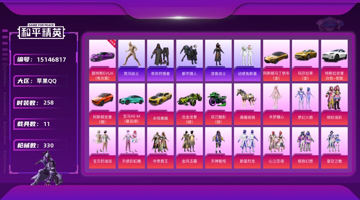 [15146817]【店主推荐捡漏号!可直接换绑】/素材身法号/老木乃伊/无敌战神框2/绝世印记3 苹果 手Q-无敌战神框-23粉装-15特效枪-11载具-8粉色飞行器-13.7w热力值-23王牌印记-258套装-330枪皮【红色载具】:路特斯EVIJA(电光紫)(三级)【热门品类】:粉装-梦幻火箭,粉装-缤纷油彩,套装-浪漫天命,套装-都市猎人,套装-冥河战士,套装-小丑鱼,套装-奇异狩猎者,套装-浪客战士,套装-动感兔斯基人偶服,套装-龟仙人,套装-潮萌小黄鸭,套装-暗影哥特,套装-浪漫波比,套装-粉红小猪【粉色载具】:特斯拉Model X(珍珠白),阿斯顿马丁DBS(金),阿斯顿马丁DBX(橙),路特斯EVIJA(电光紫),玛莎拉蒂Ghibli(金),宝马X6 M(曼岛绿),永恒黄蜂,合金龙骨(绿),双人摩托-双刃魅影(绿),空客H135-蔚蓝之翼,黑曜夜骑【粉色套装】:粉装-宝贝奶油派,粉装-天使彩虹糖,粉装-梦幻火箭,粉装-华贵君王,粉装-金风玉露,粉装-缤纷油彩,粉装-天禅智恒,粉装-新星烈龙,粉装-心之恋语,粉装-极致幻想,粉装-星空之魅,粉装-潮汐统领,粉装-锦绣火鲤,粉装-黄蜂伯爵,粉装-迷蝶贵族,粉装-星点战士,粉装-绚金战神,粉装-香水柠檬,粉装-星之彼岸,角色-零号机款机体服,角色-萨利娅,粉装-星穹咏叹调,角色-羊梦糖心【粉色枪皮等级】:AKM-炫紫旋律(七级),SCAR-L-梦幻火箭(七级),M416-五爪金龙(七级),M416-心之恋语(一级),GROZA-香水柠檬(四级),AUG-暖羊咩咩(五级),M762-甜蜜誓约(四级),UZI-绮梦青鸾(四级),汤姆逊-热量炸弹(五级),AKS-74U-星穹咏叹调(六级),Kar98K-巳巳如意(五级),Mini14-荧光虫舞(四级),Mk14-甜梦熊击(五级),DP-28-扶摇飞仙(四级),DP-28-豹影疾电(二级)【粉色飞行器】:梦幻火箭飞行器,神秘黑猫飞行器,心之恋语飞行翼,潮汐统领飞行器,锦绣火鲤飞行器,激战未来飞行器,英伦信使飞行器,灵猫魔法师飞行器