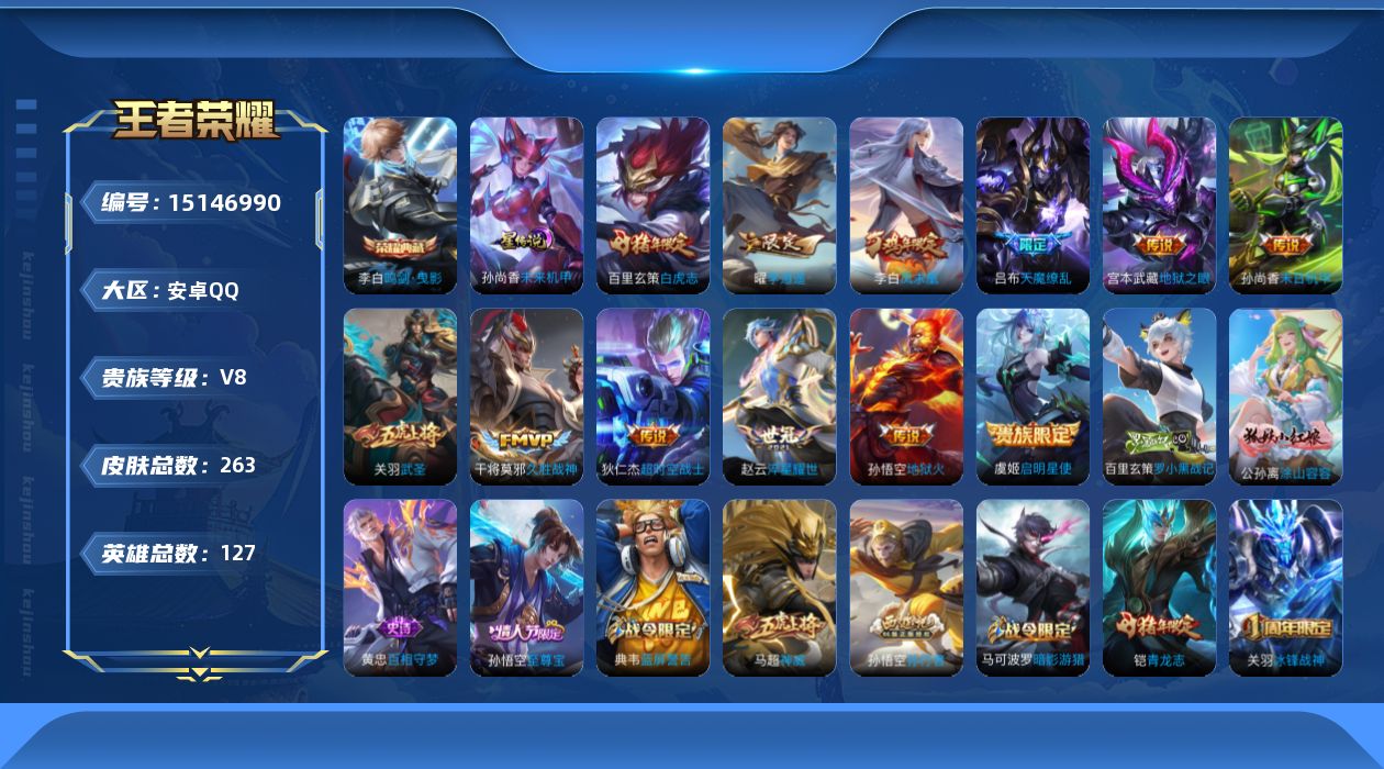[15146990]【店主推荐捡漏号!可直接换绑】安卓Q-V8-最强王者段位-127英雄-263皮肤-1典藏皮肤-1星元-12传说-77史诗 【英雄全皮】:猪八戒全皮 【荣耀典藏】:李白鸣剑曳影 【传说皮肤】:赵云淬星耀世,曜李逍遥 ,虞姬启明星使,关羽武圣,干将莫邪久胜战神,百里玄策白虎志,李白凤求凰,孙尚香末日机甲,宫本武藏地狱之眼,孙悟空地狱火,吕布天魔缭乱,狄仁杰超时空战士 【限定皮肤】:白起狰,姜子牙天穹之誓,狄仁杰阴阳师,小乔纯白花嫁,虞姬凯尔特女王,赵云皇家上将,墨子神迹守卫,嬴政优雅恋人,嬴政白昼王子,鲁班七号狮舞东方,高渐离玩趣恶龙,阿轲迷踪丽影,孙膑妖精王,扁鹊炼金王,芈月重明,芈月幻夜卜梦,吕布天魔缭乱,吕布猎兽之王,周瑜真爱至上,周瑜赤莲之焰,元歌云间偶戏,夏侯惇朔风刀,甄姬游园惊梦,曹操烛龙,典韦穷奇,典韦蓝屏警告,马可波罗逐梦之星,马可波罗暗影游猎,狄仁杰魔术师,狄仁杰万华元夜,达摩星际陆战队,达摩沙漠行僧,项羽海滩派对,项羽霸王别姬,老夫子醍醐杖,老夫子航海奇遇记,关羽冰锋战神,关羽武圣,貂蝉逐梦之音,程咬金演武夺筹,刘邦夺宝奇兵,韩信傲雪梅枪,王昭君凤凰于飞,兰陵王驯魔猎人,兰陵王金庭之子,花木兰青春决赛季,亚瑟潮玩骑士王,孙悟空至尊宝,孙悟空孙行者,牛魔御旌,后羿辉光之辰,后羿圣弓游侠,张飞虎魄,李元芳银河之约,李元芳云中旅人,虞姬霸王别姬,虞姬启明星使,钟馗神迹守卫,钟馗驱傩正仪,杨玉环遇见飞天,女娲朔望之晖,干将莫邪真爱魔法,雅典娜单词大作战,雅典娜黎明之约,太乙真人饕餮,鬼谷子原初探秘者,黄忠烈魂,黄忠火炮绅士,铠青龙志,苏烈千军破阵,百里玄策白虎志,弈星混沌棋,沈梦溪星空之诺,沈梦溪大漠名商,明世隐疑决卦,裴擒虎天狼狩猎者,裴擒虎李小龙,裴擒虎擒涛扼浪,狂铁御狮,米莱狄御霄,米莱狄胡桃异想国,云中君时之祈愿,盾山御銮,猪八戒西部大镖客,猪八戒猪悟能,上官婉儿梁祝,曜李逍遥 ,蒙犽狂想玩偶喵,鲁班大师探海日志,桑启海盐诗旅,张良古海寻踪,鬼谷子天穹祈灯,周瑜熔金海岸 【年限皮肤】:百里玄策白虎志,铠青龙志,王昭君凤凰于飞,李白凤求凰,后羿辉光之辰,马超神威,关羽武圣,黄忠烈魂,张飞虎魄 【赛季限定】:孙膑妖精王,扁鹊炼金王,白起狰,芈月重明,夏侯惇朔风刀,曹操烛龙,典韦穷奇,狄仁杰万华元夜,达摩沙漠行僧,老夫子醍醐杖,程咬金演武夺筹,兰陵王金庭
