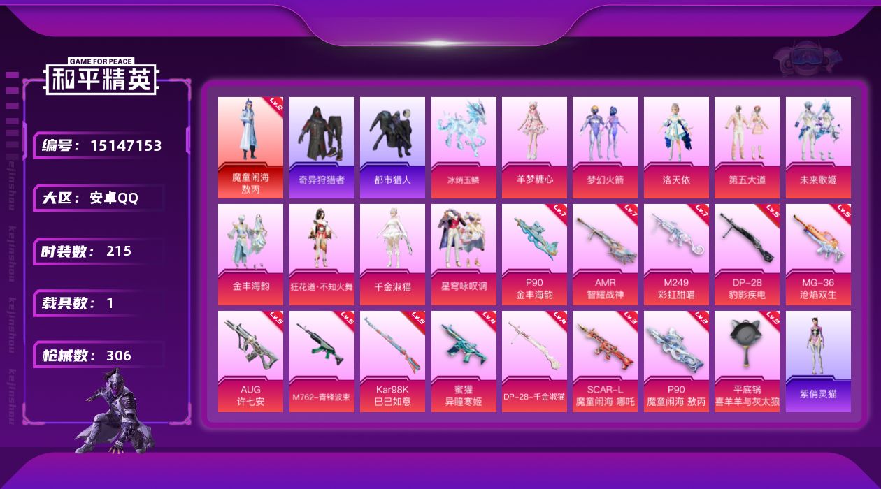 [15147153]【店主推荐捡漏号!可直接换绑】/素材身法号/扭蛋碎片570 安卓 手Q-1神装-9粉装-13特效枪-1载具-6粉色飞行器-9.8w热力值-17王牌印记-215套装-306枪皮【红色神装等级】:魔童闹海-敖丙(二级)【热门品类】:粉装-梦幻火箭,套装-都市猎人,套装-奇异狩猎者,套装-AG战队服,套装-龟仙人,套装-粉红小猪,角色-Mark.06【粉色载具】:冰绡玉鳞【粉色套装】:粉装-梦幻火箭,角色-洛天依,粉装-第五大道,粉装-未来歌姬,粉装-金丰海韵,角色-狂花道·不知火舞,角色-千金淑猫,粉装-星穹咏叹调,角色-羊梦糖心【粉色枪皮等级】:SCAR-L-魔童闹海 哪吒(三级),AUG-许七安(五级),M762-青锋波束(五级),蜜獾-异瞳寒姬(四级),P90-金丰海韵(七级),P90-魔童闹海 敖丙(三级),Kar98K-巳巳如意(五级),AMR-智耀战神(七级),M249-彩虹甜喵(七级),DP-28-千金淑猫(四级),DP-28-豹影疾电(五级),MG-36-沧焰双生(五级),平底锅-喜羊羊与灰太狼(二级)【粉色飞行器】:星夜魔法师飞行翼,幽焰列车飞行器,凤舞九天飞行器,飞天猪飞行器,灵珠游龙飞行器