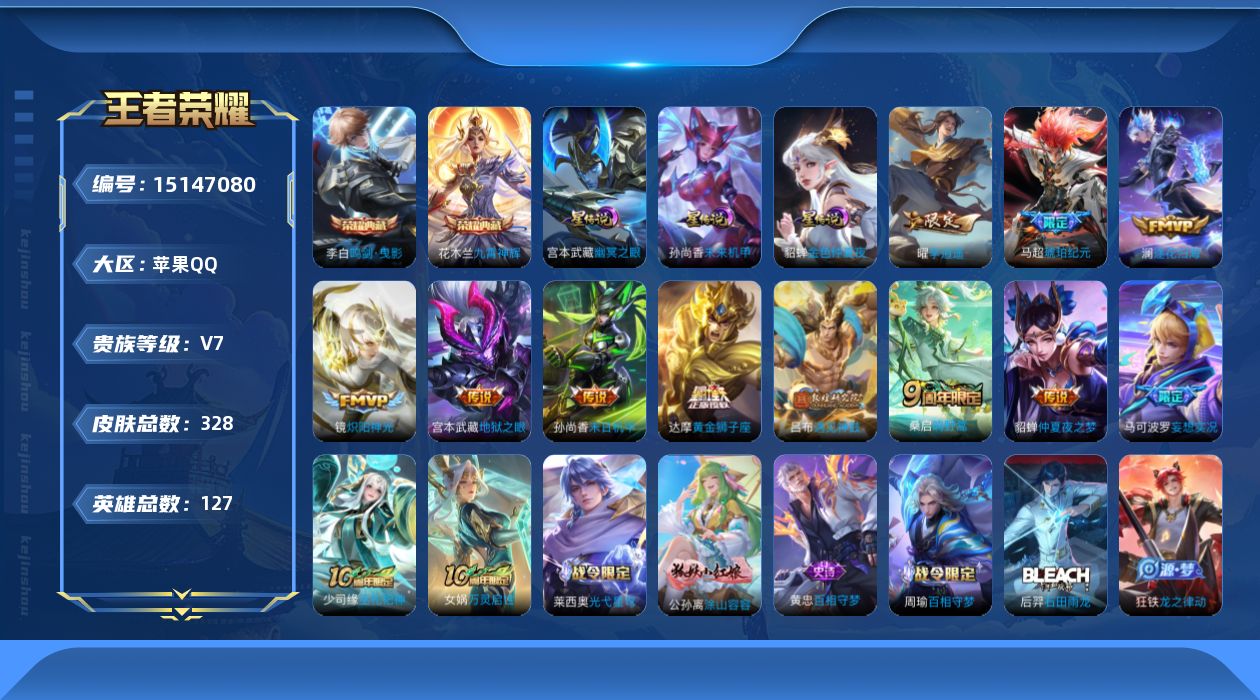 - [11351576]实名: 可修改 性别: 男号 贵族等级: V7 英雄数: 124 皮肤数: 226 珍品传说: 怪盗基德,时之奇旅-孙策 传说皮: 云鹰飞将,久胜战神,炽阳神光,末日机甲-孙尚香,音你心动-小乔,地狱之眼,乞巧织情,音你闪耀,画中仙,黄金天蝎座,玄雷天君,续相思 限定皮: 李小龙,辉光之辰,天魔缭乱,鸣野蒿,逐霄战戟,愿照·山河定,愿照·岁时盈,愿照·九州拓