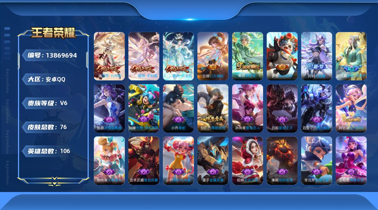 [13869694]3蛇年 安卓Q-76皮肤-6传说-20史诗 【传说皮肤】:妲己愿照众生和,澜愿照九州拓,虞姬愿照岁时盈,云缨幻光神枪,桑启鸣野蒿,梦奇胖达荣荣 【限定皮肤】:姜子牙天穹之誓,狄仁杰阴阳师,赵云皇家上将,孙尚香蔷薇恋人,项羽海滩派对,裴擒虎擒涛扼浪,鲁班大师探海日志,桑启海盐诗旅,阿古朵江河有灵,张良古海寻踪,鬼谷子天穹祈灯,沈梦溪龙舞盛年,刘邦剑破天穹,程咬金群星魔术团 【赛季限定】:张良古海寻踪,裴擒虎擒涛扼浪,鲁班大师探海日志,桑启海盐诗旅,鬼谷子天穹祈灯,刘邦剑破天穹,姜子牙天穹之誓 【史诗皮肤】:赵云皇家上将,貂蝉圣诞恋歌,甄姬冰雪圆舞曲,王昭君偶像歌手,廉颇地狱岩魂,宫本武藏鬼剑武藏,孙尚香蔷薇恋人,孙尚香水果甜心,墨子金属风暴,小乔缤纷独角兽,雅典娜冰冠公主,百里守约特工魅影,李元芳逐浪之夏,白起星夜王子,狄仁杰鹰眼统帅,小乔青蛇,刘禅电玩爆裂旋风,阿古朵江河有灵,赵怀真器灵浮梦炉,阿轲化蝶舞 【其他皮肤】:项羽海滩派对,韩信教廷特使,赵云白执事,芈月红桃皇后,武则天东方不败,孙膑天使之翼,妲己少女阿狸,典韦黄金武士,达摩拳王,花木兰兔女郎,狄仁杰阴阳师,刘备纽约教父,关羽龙腾万里,孙尚香沉稳之力,狂铁特工战影,鲁班大师乓乓大师,桑启海盐诗旅,裴擒虎擒涛扼浪,太乙真人劲辣红锅,鲁班大师探海日志,李元芳妄想特派,张良古海寻踪,鬼谷子天穹祈灯,沈梦溪龙舞盛年,刘邦剑破天穹,程咬金群星魔术团,姜子牙天穹之誓,盘古敬我三分,东皇太一噬灭天穹,干将莫邪雾都夜雨,太乙真人谧流熔炉,西施雪境奇遇,达摩爆裂喵拳,明世隐景韶洛都,戈娅玫蓝誓约,刘备浪漫序章,鲁班七号木偶奇遇记,花木兰剑舞者,张良一千零一夜,孙悟空西部大镖客,后羿精灵王,兰陵王隐刃,马可波罗激情绿茵,杨戬埃及法老,明世隐占星师,元歌午夜歌剧院,伽罗花见巫女,李信灼热之刃,嫦娥露花倒影,盘古创世神祝 【内测皮肤】:孙尚香蔷薇恋人,狂铁特工战影 【营地ID】:1820869907