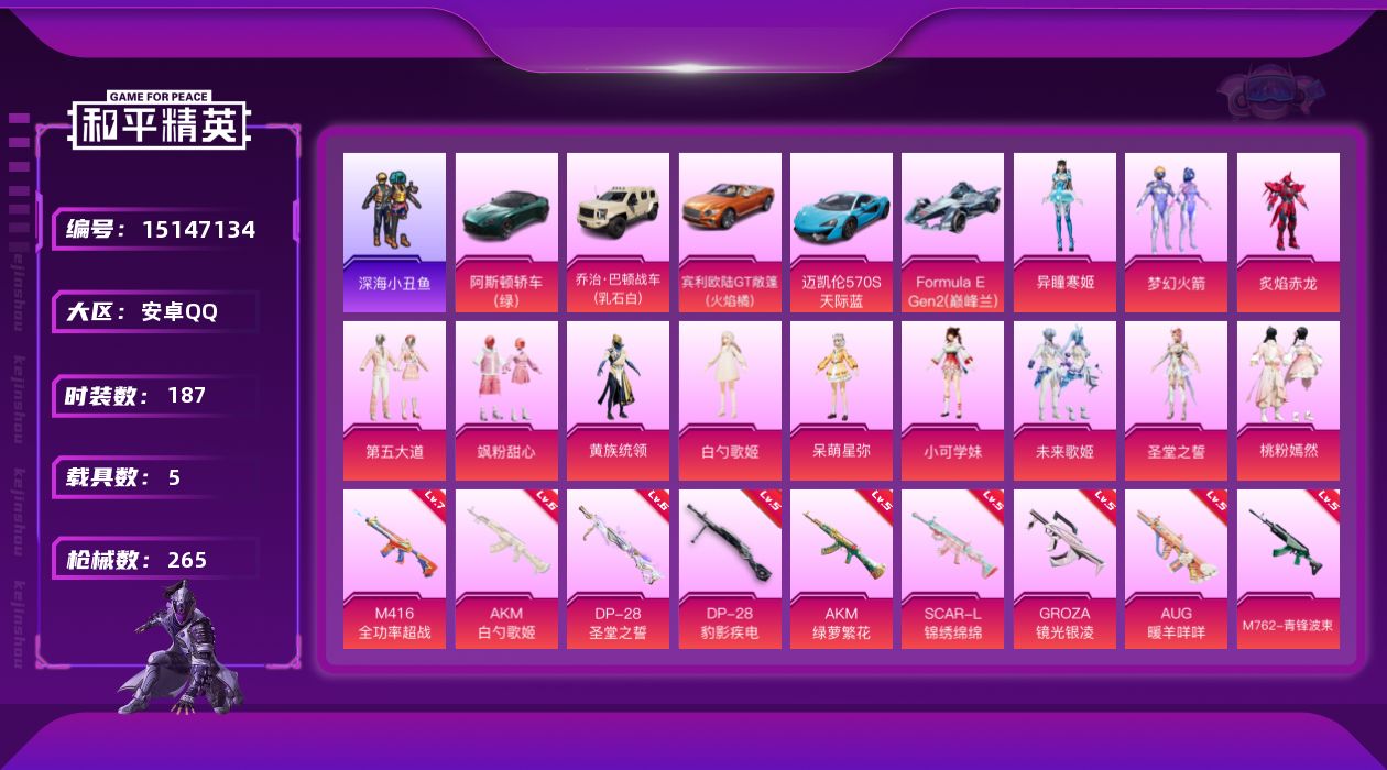 [15147134]可二次【店主推荐捡漏号!可直接换绑】安卓 手Q-12粉装-12特效枪-5载具-4粉色飞行器-86089热力值-9王牌印记-187套装-265枪皮【热门品类】:粉装-梦幻火箭,套装-深海小丑鱼,套装-小丑鱼,套装-AG战队服,套装-龟仙人【粉色载具】:阿斯顿马丁DBS(绿),乔治巴顿战车(乳石白),宾利欧陆GT敞篷(火焰橘),迈凯伦570S(天际蓝),Formula E Gen2(巅峰兰),空客H135-蔚蓝之翼=【粉色套装】:粉装-梦幻火箭,粉装-炙焰赤龙,粉装-第五大道,粉装-飒粉甜心,粉装-黄族统领,角色-白勺歌姬,角色-呆萌星弥,角色-小可学妹,粉装-未来歌姬,角色-圣堂之誓,粉装-桃粉嫣然,角色-异瞳寒姬【粉色枪皮等级】:AKM-白勺歌姬(六级),AKM-绿萝繁花(五级),SCAR-L-锦绣绵绵(五级),M416-全功率超战(七级),GROZA-镜光银凌(五级),AUG-暖羊咩咩(五级),M762-青锋波束(五级),Vector-飒粉甜心(五级),Kar98K-巳巳如意(五级),DP-28-暗夜鎏金(一级),DP-28-圣堂之誓(六级),DP-28-豹影疾电(五级)【粉色枪皮】:AKM-白勺歌姬,AKM-绿萝繁花,SCAR-L-锦绣绵绵,M416-全功率超战,GROZA-镜光银凌,AUG-暖羊咩咩,M762-青锋波束,Vector-飒粉甜心,Kar98K-巳巳如意,DP-28-暗夜鎏金,DP-28-圣堂之誓,DP-28-豹影疾电【粉色飞行器】:梦幻舞会飞行器,黄族统领飞行器,英伦信使飞行器