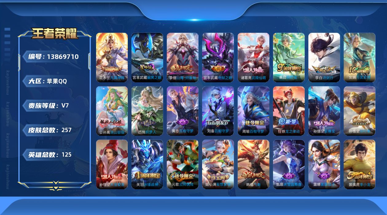 - [11528600]V7 1典藏 13传说 125英雄 255皮肤 可修改实名 优质装备:弑枪猎影(韩信典藏),云鹰飞将(小将军),黄金白羊座,一念神魔,末日机甲-孙尚香(绿蚂蚱),地狱火,零号·赤焰,飞鸢探春,碎云,澜逐花归海 传说皮:乘龙·问璇玑(孙尚香年限) 珍宝阁皮:优雅恋人,蔷薇恋人 限定皮:鸣野蒿,至尊宝,傲雪梅枪,山海·碧波行(瑶年限),至美·乘鲤谣,高山流水,齐天大圣,五谷丰年,青龙志(铠年限),梁祝,李小龙,朱雀志(守约年限),如梦令-后羿,孙行者,一生所爱,女儿国国王,寅虎·御盾(廉颇年限),寅虎·瑞焰(虎皮蛋子),玉兔公主,唐三藏 史诗皮:怒海争锋,破空之剑,涂山红红,东方月初,蒙犽顽岩魄,琥珀纪元伽罗,蔬乡物语(鲁班七号),千年之狐,江河有灵,魅语,百解令(蒙犽),蒙恬荣光圣徽,冰冠公主,电玩·爆裂旋风,暗夜猫娘,龙骑士(小龙虾),末日机甲-吕布,猫狗日记-孙策,猫狗日记-大乔,乱世虎臣,修罗,女仆咖啡,水果甜心,绅士熊喵,天才门将,星夜王子,功夫厨神,德古拉伯爵,暗隐猎兽者,鬼剑武藏,舞动绿茵,地狱岩魂,繁星吟游(呼啦呼啦),拒霜思,缤纷独角兽,乘风破浪,逐浪之夏,水晶猎龙者,曙光守护者,金属风暴,原初追逐者,圣诞狂欢,圣诞恋歌,鹰眼统帅,寅虎·御盾,无心,未来纪元-赵云