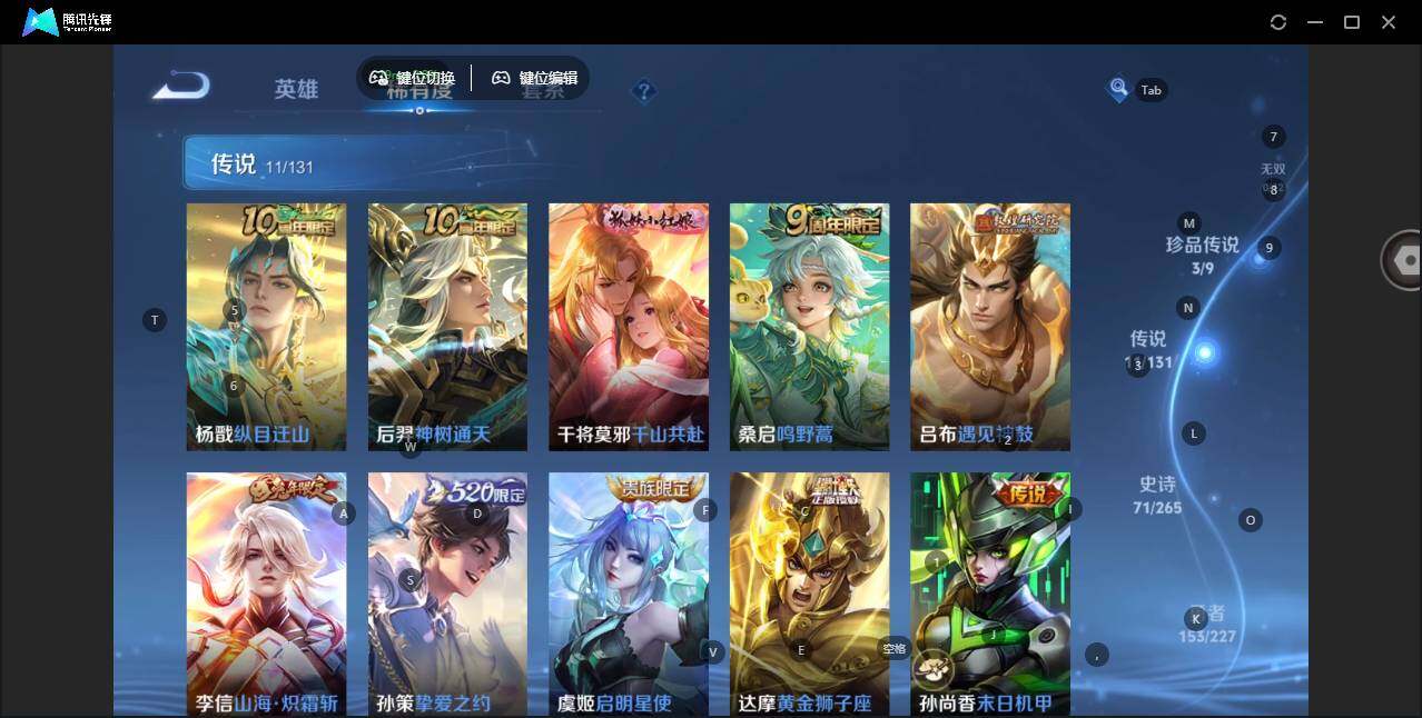 【传说皮肤】:杨戬纵目迁山,后羿神树通天,干将莫邪千山共赴,桑启鸣野蒿,吕布遇见神鼓,李信山海炽霜斩,孙策挚爱之约,虞姬启明星使,达摩黄金狮子座,孙尚香末日机甲,宫本武藏地狱之眼