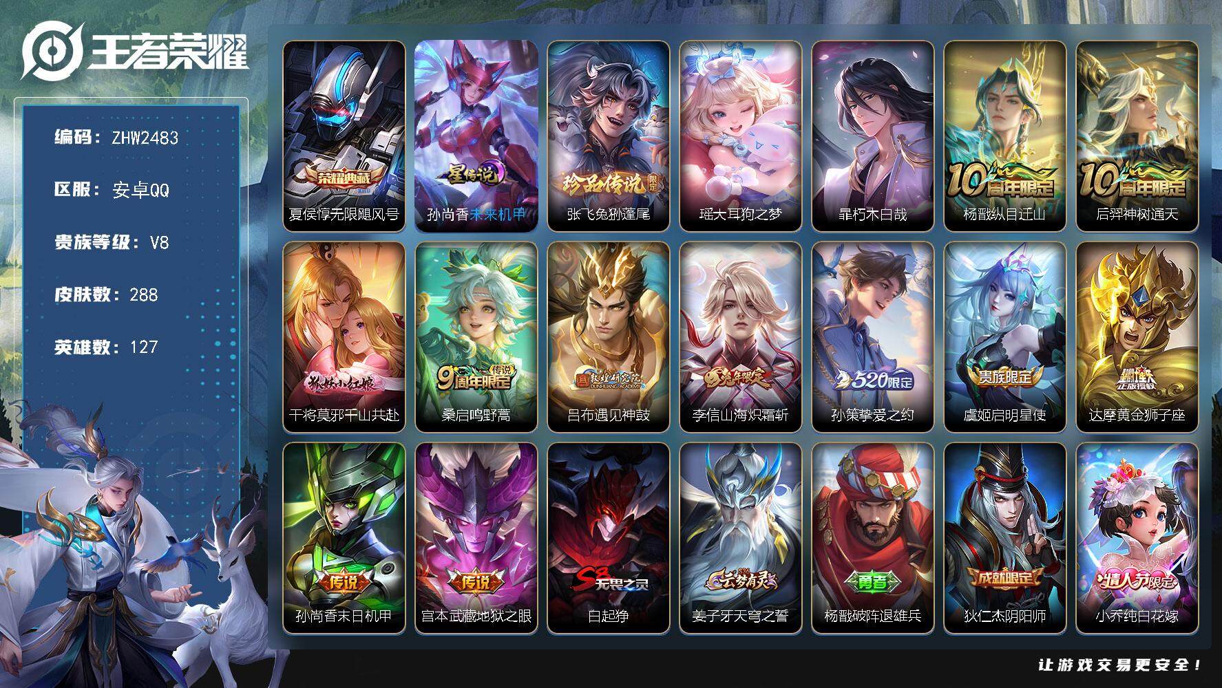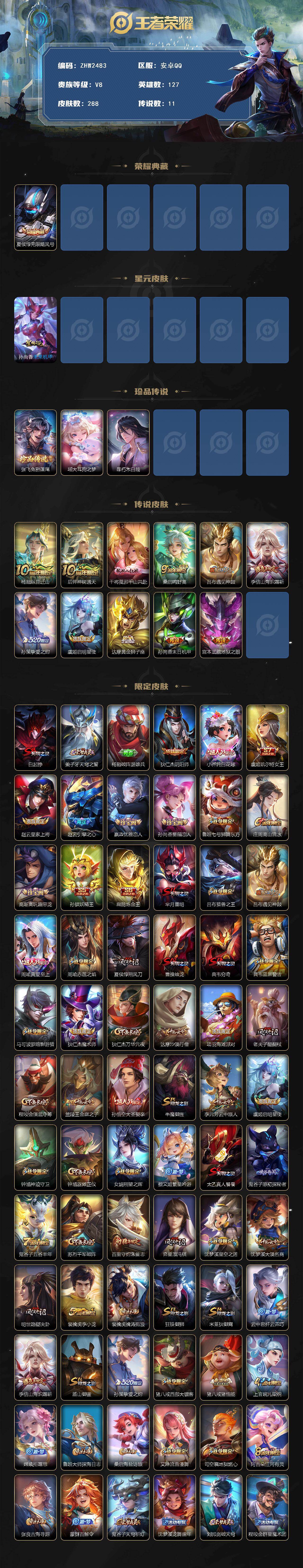 [15147184]【店主推荐捡漏号!可直接换绑】安卓Q-V8-最强王者段位-127英雄-288皮肤-1典藏皮肤-3珍品传说-11传说-1星元-71史诗 【英雄全皮】:孙权全皮,猪八戒全皮,空空儿全皮 【荣耀典藏】:夏侯惇无限飓风号 【珍品传说】:张飞兔狲蓬尾,瑶大耳狗之梦,暃朽木白哉 【传说皮肤】:杨戬纵目迁山,后羿神树通天,干将莫邪千山共赴,桑启鸣野蒿,吕布遇见神鼓,李信山海炽霜斩,孙策挚爱之约,虞姬启明星使,达摩黄金狮子座,孙尚香末日机甲,宫本武藏地狱之眼 【限定皮肤】:白起狰,姜子牙天穹之誓,杨戬破阵退雄兵,狄仁杰阴阳师,小乔纯白花嫁,虞姬凯尔特女王,赵云皇家上将,赵云引擎之心,嬴政优雅恋人,孙尚香蔷薇恋人,鲁班七号狮舞东方,庄周高山流水,高渐离玩趣恶龙,孙膑妖精王,扁鹊炼金王,芈月重明,吕布猎兽之王,吕布遇见神鼓,周瑜真爱至上,周瑜赤莲之焰,夏侯惇朔风刀,曹操烛龙,典韦穷奇,典韦蓝屏警告,马可波罗暗影游猎,狄仁杰魔术师,狄仁杰万华元夜,达摩沙漠行僧,项羽海滩派对,老夫子醍醐杖,程咬金演武夺筹,兰陵王金庭之子,孙悟空大圣娶亲,牛魔御旌,李元芳云中旅人,虞姬启明星使,钟馗神迹守卫,钟馗驱傩正仪,女娲朔望之晖,蔡文姬繁星吟游,太乙真人饕餮,鬼谷子原初探秘者,鬼谷子五谷丰年,苏烈千军破阵,百里守约朱雀志,弈星混沌棋,沈梦溪星空之诺,沈梦溪大漠名商,明世隐疑决卦,裴擒虎李小龙,裴擒虎擒涛扼浪,狂铁御狮,米莱狄御霄,云中君纤云弄巧,李信山海炽霜斩,盾山御銮,孙策挚爱之约,猪八戒西部大镖客,猪八戒猪悟能,上官婉儿梁祝,嫦娥拒霜思,鲁班大师探海日志,桑启海盐诗旅,艾琳流音漫舞,司空震地狱燃心,阿古朵江河有灵,张良古海寻踪,蒙犽百解令,鬼谷子天穹祈灯,沈梦溪龙舞盛年,刘邦剑破天穹,程咬金群星魔术团 【年限皮肤】:百里守约朱雀志,李信山海炽霜斩 【赛季限定】:孙膑妖精王,扁鹊炼金王,白起狰,芈月重明,夏侯惇朔风刀,曹操烛龙,典韦穷奇,狄仁杰万华元夜,达摩沙漠行僧,老夫子醍醐杖,程咬金演武夺筹,兰陵王金庭之子,张良古海寻踪,牛魔御旌,李元芳云中旅人,虞姬凯尔特女王,钟馗驱傩正仪,太乙真人饕餮,鬼谷子原初探秘者,苏烈千军破阵,弈星混沌棋,沈梦溪大漠名商,明世隐疑决卦,裴擒虎擒涛扼浪,狂铁御狮,米莱狄御霄,盾山御銮,鲁班大师探海日志,桑启海盐诗旅,鬼谷子天穹祈灯,刘邦剑破天穹,姜子牙天穹之誓 【战令