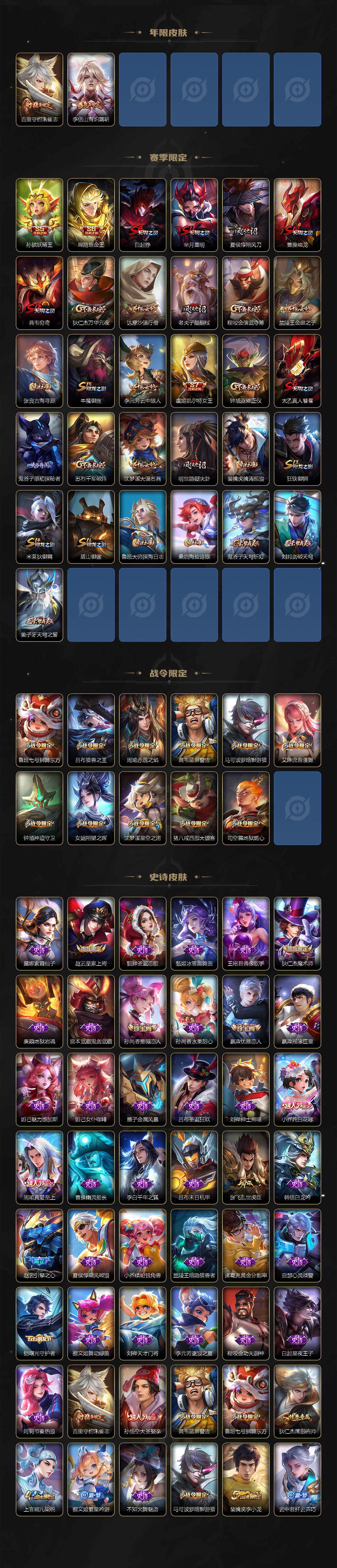 【赛季限定】:孙膑妖精王,扁鹊炼金王,白起狰,芈月重明,夏侯惇朔风刀,曹操烛龙,典韦穷奇,狄仁杰万华元夜,达摩沙漠行僧,老夫子醍醐杖,程咬金演武夺筹,兰陵王金庭之子,张良古海寻踪,牛魔御旌,李元芳云中旅人,虞姬凯尔特女王,钟馗驱傩正仪,太乙真人饕餮,鬼谷子原初探秘者,苏烈千军破阵,弈星混沌棋,沈梦溪大漠名商,明世隐疑决卦,裴擒虎擒涛扼浪,狂铁御狮,米莱狄御霄,盾山御銮,鲁班大师探海日志,桑启海盐诗旅,鬼谷子天穹祈灯,刘邦剑破天穹,姜子牙天穹之誓