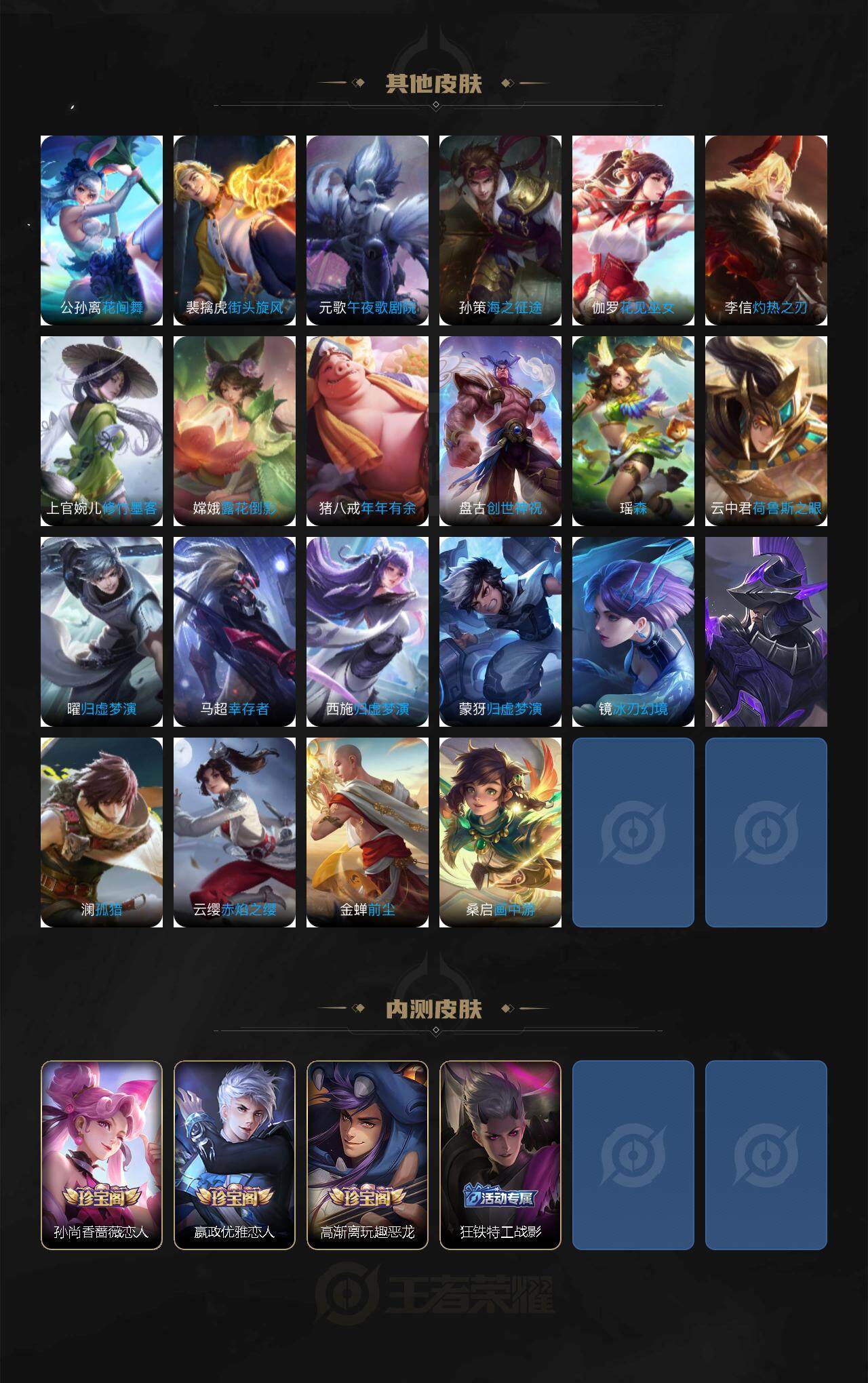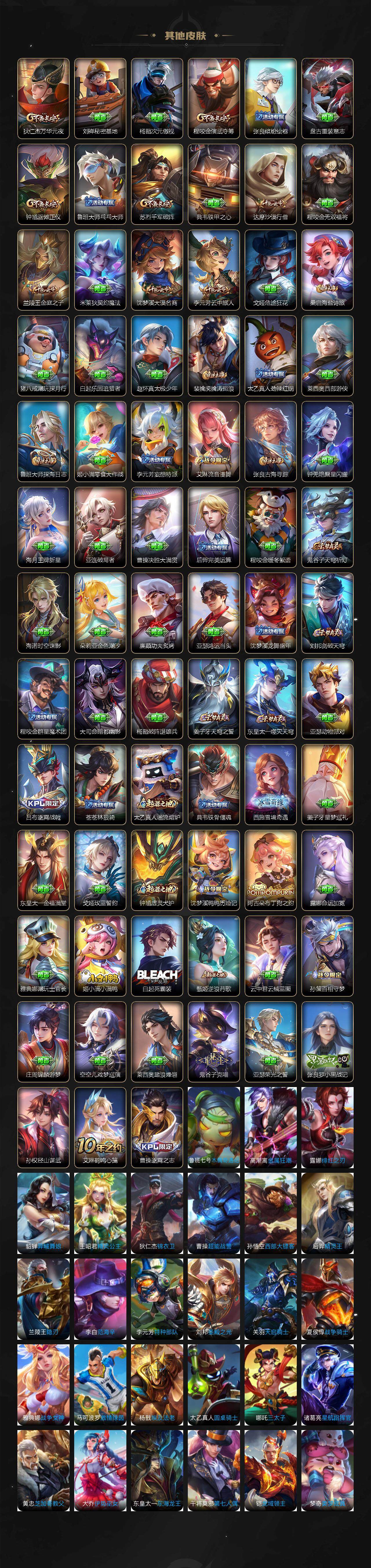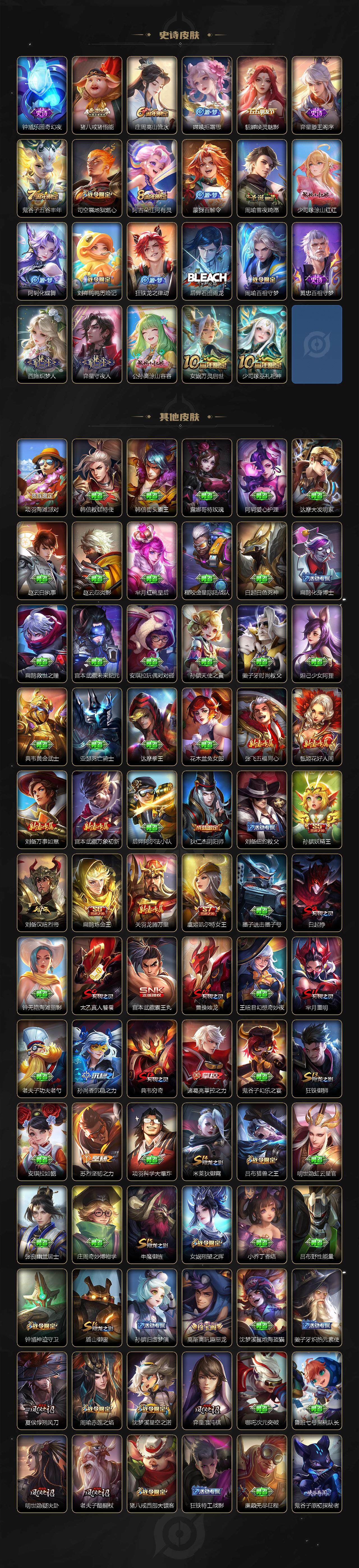【限定皮肤】:白起狰,姜子牙天穹之誓,杨戬破阵退雄兵,狄仁杰阴阳师,小乔纯白花嫁,虞姬凯尔特女王,赵云皇家上将,赵云引擎之心,嬴政优雅恋人,孙尚香蔷薇恋人,鲁班七号狮舞东方,庄周高山流水,高渐离玩趣恶龙,孙膑妖精王,扁鹊炼金王,芈月重明,吕布猎兽之王,吕布遇见神鼓,周瑜真爱至上,周瑜赤莲之焰,夏侯惇朔风刀,曹操烛龙,典韦穷奇,典韦蓝屏警告,马可波罗暗影游猎,狄仁杰魔术师,狄仁杰万华元夜,达摩沙漠行僧,项羽海滩派对,老夫子醍醐杖,程咬金演武夺筹,兰陵王金庭之子,孙悟空大圣娶亲,牛魔御旌,李元芳云中旅人,虞姬启明星使,钟馗神迹守卫,钟馗驱傩正仪,女娲朔望之晖,蔡文姬繁星吟游,太乙真人饕餮,鬼谷子原初探秘者,鬼谷子五谷丰年,苏烈千军破阵,百里守约朱雀志,弈星混沌棋,沈梦溪星空之诺,沈梦溪大漠名商,明世隐疑决卦,裴擒虎李小龙,裴擒虎擒涛扼浪,狂铁御狮,米莱狄御霄,云中君纤云弄巧,李信山海炽霜斩,盾山御銮,孙策挚爱之约,猪八戒西部大镖客,猪八戒猪悟能,上官婉儿梁祝,嫦娥拒霜思,鲁班大师探海日志,桑启海盐诗旅,艾琳流音漫舞,司空震地狱燃心,阿古朵江河有灵,张良古海寻踪,蒙犽百解令,鬼谷子天穹祈灯,沈梦溪龙舞盛年,刘邦剑破天穹,程咬金群星魔术团