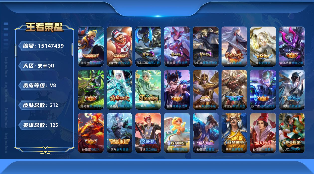 [15147439]可二次,【店主推荐捡漏号!可直接换绑】,安卓Q-V8-最强王者段位-125英雄-212皮肤-2典藏皮肤-13传说-53史诗 【荣耀典藏】:孙悟空全息碎影,程咬金活力突击 【传说皮肤】:桑启鸣野蒿,诸葛亮时雨天司,镜炽阳神光,虞姬启明星使,孙悟空零号赤焰,虞姬云霓雀翎,后羿黄金射手座,貂蝉仲夏夜之梦,李白凤求凰,孙尚香末日机甲,宫本武藏地狱之眼,孙悟空地狱火,狄仁杰超时空战士 【限定皮肤】:狄仁杰阴阳师,赵云皇家上将,赵云引擎之心,妲己时之彼端,鲁班七号狮舞东方,阿轲迷踪丽影,芈月白晶晶,吕布猎兽之王,周瑜赤莲之焰,元歌云间偶戏,夏侯惇朔风刀,典韦蓝屏警告,狄仁杰魔术师,狄仁杰万华元夜,项羽海滩派对,老夫子醍醐杖,程咬金演武夺筹,刘邦夺宝奇兵,韩信飞衡,兰陵王驯魔猎人,亚瑟潮玩骑士王,孙悟空至尊宝,孙悟空大圣娶亲,孙悟空零号赤焰,牛魔御旌,李元芳银河之约,虞姬启明星使,钟馗神迹守卫,钟馗驱傩正仪,女娲朔望之晖,雅典娜单词大作战,蔡文姬繁星吟游,鬼谷子原初探秘者,诸葛亮时雨天司,百里守约朱雀志,弈星混沌棋,沈梦溪星空之诺,明世隐疑决卦,裴擒虎李小龙,米莱狄御霄,云中君纤云弄巧,盾山御銮,蒙犽狂想玩偶喵,沈梦溪龙舞盛年,鲁班七号蔬乡物语 【年限皮肤】:百里守约朱雀志,李白凤求凰,诸葛亮时雨天司,韩信飞衡 【赛季限定】:夏侯惇朔风刀,狄仁杰万华元夜,老夫子醍醐杖,程咬金演武夺筹,牛魔御旌,钟馗驱傩正仪,鬼谷子原初探秘者,弈星混沌棋,明世隐疑决卦,米莱狄御霄,盾山御銮 【战令限定】:鲁班七号狮舞东方,阿轲迷踪丽影,吕布猎兽之王,周瑜赤莲之焰,元歌云间偶戏,典韦蓝屏警告,刘邦夺宝奇兵,兰陵王驯魔猎人,亚瑟潮玩骑士王,李元芳银河之约,钟馗神迹守卫,女娲朔望之晖,雅典娜单词大作战,沈梦溪星空之诺,蒙犽狂想玩偶喵,鲁班七号蔬乡物语 【史诗皮肤】:鲁班七号电玩小子,露娜紫霞仙子,赵云皇家上将,赵云未来纪元,貂蝉圣诞恋歌,甄姬冰雪圆舞曲,王昭君偶像歌手,狄仁杰魔术师,孙尚香水果甜心,妲己魅力维加斯,妲己女仆咖啡,吕布圣诞狂欢,李白千年之狐,吕布末日机甲,韩信白龙吟,孙悟空至尊宝,赵云引擎之心,花木兰水晶猎龙者,夏侯惇乘风破浪,兰陵王暗隐猎兽者,诸葛亮黄金分割率,雅典娜冰冠公主,安琪拉心灵骇客,百里守约特工魅影,铠曙光守护者,李元芳逐浪之夏,白起星夜王子,阿轲节奏热浪,孙策猫狗日记,百里