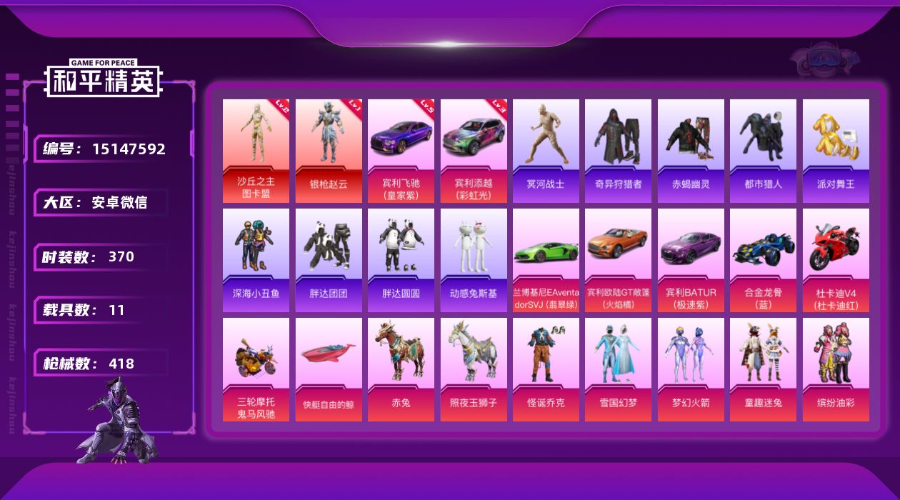 [15147592]老木乃伊-2神装-67粉装-33特效枪-11载具+1僚机-14粉色飞行器-195362热力值-20王牌印记-370套装-418枪皮 【红色载具】:宾利添越(彩虹光)(三级),宾利飞驰(皇家紫)(五级) 【红色神装等级】:沙丘之主-图卡盟(二级),角色-银枪赵云(一级) 【热门品类】:粉装-怪诞乔克,粉装-雪国幻梦,粉装-梦幻火箭,粉装-童趣迷兔,粉装-缤纷油彩,粉装-繁龙极客,套装-浪漫天命,套装-赤蝎幽灵,套装-都市猎人,套装-冥河战士,套装-派对舞王,套装-深海小丑鱼,套装-小丑鱼,套装-奇异狩猎者,角色-军刀雅典娜,套装-胖达团团,套装-胖达圆圆,套装-动感兔斯基人偶服,角色-忠猛周仓,角色-忠真马岱,角色-忠义严颜,套装-龟仙人,套装-潮萌小黄鸭,套装-暗影哥特,套装-粉红小猪,套装-软软马卡龙,角色-8号机,角色-Mark.06,大砍刀-青龙偃月刀,撬棍-龙胆亮银枪 【粉色套装】:粉装-深海曼妙,粉装-独舞天鹅,粉装-极限特训,粉装-粉色回忆,粉装-怪诞乔克,粉装-深渊皇后,粉装-甜心巧克力,粉装-宝贝奶油派,粉装-天使彩虹糖,粉装-雪国幻梦,粉装-蝶舞迷情,粉装-梦幻火箭,粉装-金属狂野,粉装-缤纷油彩,粉装-放客神游,粉装-天禅智恒,粉装-新星烈龙,粉装-甜蜜誓约,粉装-极致幻想,粉装-星空之魅,粉装-俏皮狐尾,粉装-草莓生巧,粉装-绚金战神,粉装-冰霜白皇,粉装-童趣迷兔,粉装-炙焰红王,粉装-星之彼岸,粉装-馨动时刻,粉装-蜜桃特工,粉装-蝶舞蔷薇,粉装-暗夜玫瑰,粉装-彩虹鹿灵,角色-洛天依,角色-初号机款机体服,粉装-碧影闪光,粉装-海盐物语,粉装-恐龙拽拽,粉装-橘柚倾心,粉装-妙趣可丽,角色-复仇流浪者,粉装-暖熊萌萌,粉装-霁雪冰心,粉装-垂柳戏鸭,粉装-彩虹甜喵,女娲后裔-赵灵儿,粉装-银红美神,粉装-寒光使者,粉装-暗夜鎏金,粉装-第五大道,粉装-心之回忆,粉装-纯珍童话,粉装-仲夏莫吉托,角色-白勺歌姬,角色-呆萌星弥,粉装-射星猎手,粉装-憨憨奶龙,角色-冰炎战车,角色-紫钛骑兵,角色-圣堂之誓,角色-小叽联名款,玩偶服-猪猪侠,粉装-繁龙极客,角色-美雪,角色-美琪,角色-初号机 觉醒Ver.,粉装-金丰海韵,角色-千金淑猫 【粉色枪皮等级】:AKM-甜心宝贝(七级),AKM-梦之光华(一级),AKM-星际浪客(一级),M16