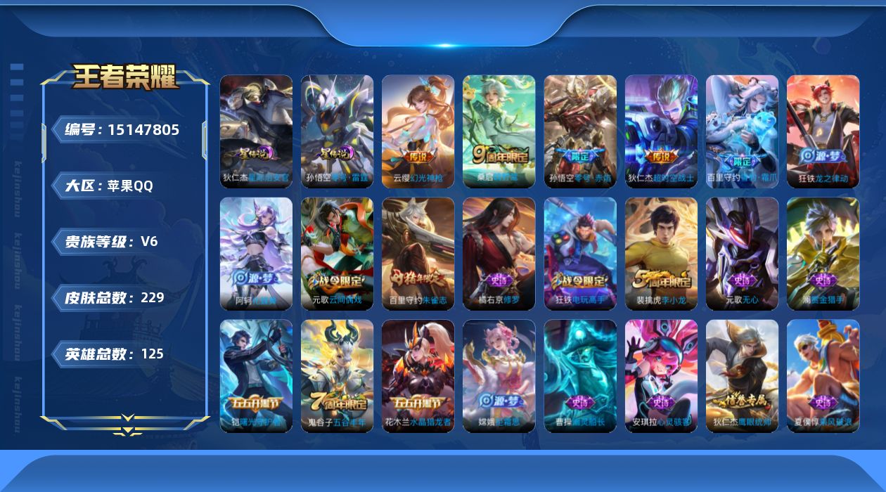- [11624828]V9 1典藏 34传说 125英雄 344皮肤 可修改实名 优质装备:全息碎影(猴子典藏),黄金狮子座,黄金射手座,云鹰飞将(小将军),黄金白羊座,炽阳神光,一念神魔,仲夏夜之梦(大飞蛾),飞鸢探春,音你心动-周瑜,李逍遥,乞巧织情,时之恋人-刘备(电焊工),游龙清影(小青龙),淬星耀世,末日机甲-孙策,无双飞将,鲁班七号-时之奇旅,大乔-时之奇旅,澜逐花归海,琥珀纪元铠,琥珀纪元马超,金乌负日,黄金天蝎座 传说皮:乘龙·问璇玑(孙尚香年限),乘龙·铭钟鼎(赵云年限),乘龙·淬吴钩(孙策年限),典韦战鼓燎原,落雪白狼,铠冥王哈迪斯 珍宝阁皮:胡桃夹子,蔷薇恋人 限定皮:傲雪梅枪,白晶晶,时雨天司(水龙头),至美·乘鲤谣,至美·化雀舞,影龙天霄,遇见飞天,匿光决锋者,五谷丰年,辉光之辰,孙行者,大圣娶亲,玉兔公主,无尽星芒,山海·玄木吟(马可年限) 史诗皮:化蝶舞,灵蛊蚀心,怒海争锋,埋骨钱,芈月浮光幕影,琥珀纪元伽罗,决胜骁骑,上官婉儿群星魔术团,奇遇星旅,蔬乡物语(鲁班七号),曹操夜都魔契,超元猎域,乘龙·聚宝船(安琪拉年限),乘龙·忆丹青(大乔年限),百相守梦-黄忠,遇见神鹿,紫霞仙子,黄金分割率,特工魅影,千年之狐,永昼,江河有灵,匿光侦查者,鹤归松栖(赵怀真),真我赫兹(百里守约),魅语,百解令(蒙犽),高渐离燃音魔法,无限星赏官,青蛇,偶像歌手,晚萤,电玩·爆裂旋风,龙骑士(小龙虾),末日机甲-吕布,猫狗日记-孙策,猫狗日记-大乔,时之恋人-孙尚香,乱世虎臣,修罗,女仆咖啡,摇滚巨星,水果甜心,绅士熊喵,天才门将,星夜王子,心灵骇客,功夫厨神,德古拉伯爵,暗隐猎兽者,幽灵船长,鬼剑武藏,暗渊魔法,心灵战警,乐园奇幻夜,舞动绿茵,纤云弄巧,拒霜思,缤纷独角兽,乘风破浪,逐浪之夏,水晶猎龙者,曙光守护者,箭羽风息,金属风暴,圣诞狂欢,圣诞恋歌,鹰眼统帅,暗夜贵公子,魅力维加斯,赏金猎手,奇遇舞章,天秀·音浪,千筹问战,顽趣-阿古朵,无心,未来纪元-赵云