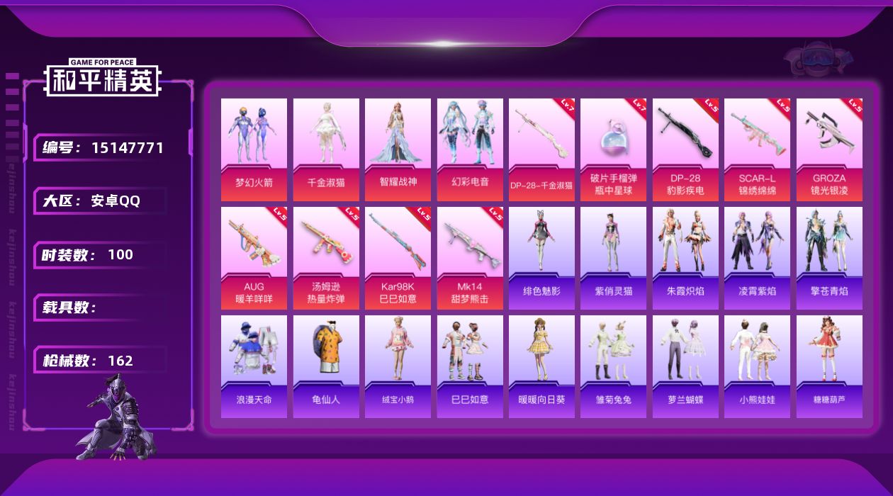 - [14451456]【1616】苹果 手Q-4粉装-6特效枪-0载具-1粉色飞行器-62858热力值-6王牌印记-158套装-214枪皮 【热门品类】:套装-浪漫天命,套装-都市猎人,套装-金羽特工,套装-龟仙人,套装-粉红小猪 【粉色套装】:粉装-吟月归客,粉装-碧影闪光,粉装-星夜魔法师,角色-智耀战神 【粉色枪皮等级】:SCAR-L-锦绣绵绵(五级),M416-五爪金龙(七级),ARX-无垠阁(五级),Kar98K-巳巳如意(五级),Mk14-甜梦熊击(五级),DP-28-豹影疾电(五级) 【粉色枪皮】:SCAR-L-锦绣绵绵,M416-五爪金龙,ARX-无垠阁,Kar98K-巳巳如意,Mk14-甜梦熊击,DP-28-豹影疾电 【粉色飞行器】:齐天大圣飞行器 【粉色降落伞】:四圣焕新降落伞,王牌四分卫降落伞,烈焰拳霸降落伞,机甲封神降落伞,焰龙焚天降落伞,蓝莓炮弹降落伞,筑梦精灵降落伞,环太平洋降落伞,彩虹甜喵降落伞,暗夜鎏金降落伞,黄族统领降落伞,精灵梦叶罗丽降落伞,荧海星豚降落伞 【稀有套装】:套装-龟仙人,角色-拉斐尔,套装-星渊小夜曲,套装-云朵鹅,套装-雪绒豹,套装-朱霞炽焰,套装-凌霄紫焰,角色-紫俏灵猫 【稀有枪皮】:AKM-奇异狩猎者,AKM-彩虹符号,AKM-环太平洋,AKM-生命誓言,AKM-破晓战魂,AKM-萌趣颜团子,AKM-虎虎生威,AKM-龙的传人,M16A4-幻世战舞者,M16A4-甜心亚梦,M16A4-千金淑猫,SCAR-L-夜灯,SCAR-L-炫彩节奏,SCAR-L-玉兔迎春,SCAR-L-红色方程式,SCAR-L-黄金龙骨,M416-夜灯,M416-糯团青竹,M416-红色方程式,M416-绯红前夜,M416-蓝色火焰,GROZA-2B战斗服款,GROZA-异彩先驱,GROZA-彩虹符号,GROZA-影袭,GROZA-梨园星光,GROZA-田园牧歌,AUG-青春冒险家,QBZ-彩虹符号,QBZ-未来歌姬,QBZ-飞驰魅影,M762-天降萌叽,M762-奇异狩猎者,M762-牛气冲天,M762-瑞龙福将,M762-绯红前夜,M762-诡娃娃,M762-云朵鹅,Mk47-洛神天依,Mk47-青春冒险家,G36C-时空追击者,AC-VAL-天降萌叽,AC-VAL-甜心亚梦,蜜獾-天降萌叽,蜜獾-娇憨猪猪,ARX-凌霄紫焰,UZI-啾咪啾咪,UZI-