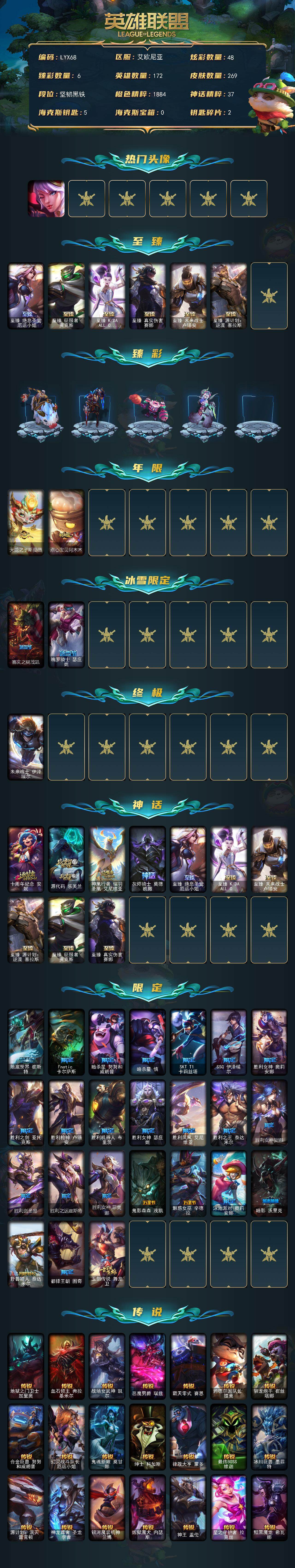 [15147790]未定级段位-172英雄-269皮肤-48炫彩-1终极-10神话-28限定-26传说-69史诗