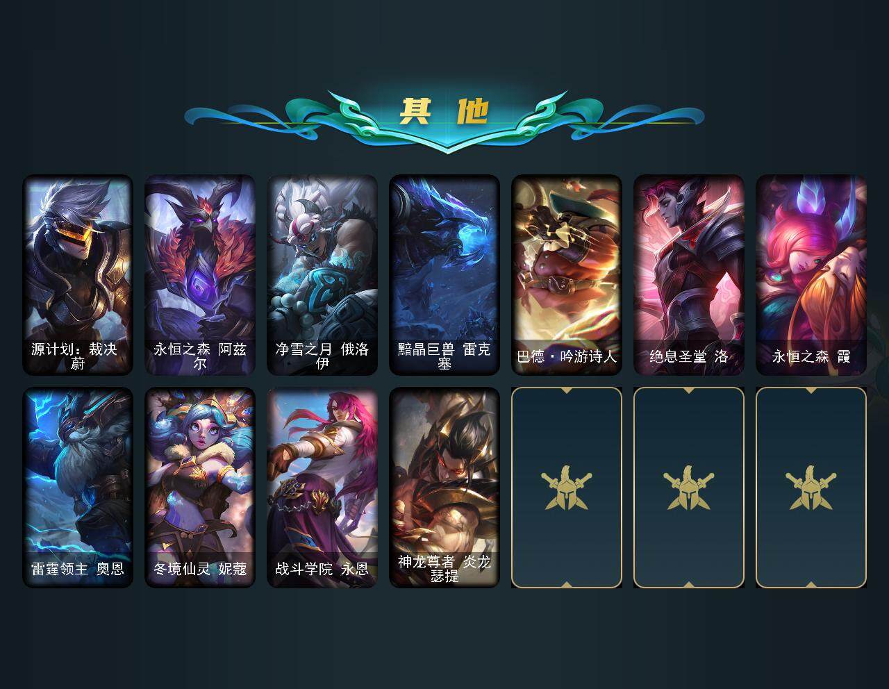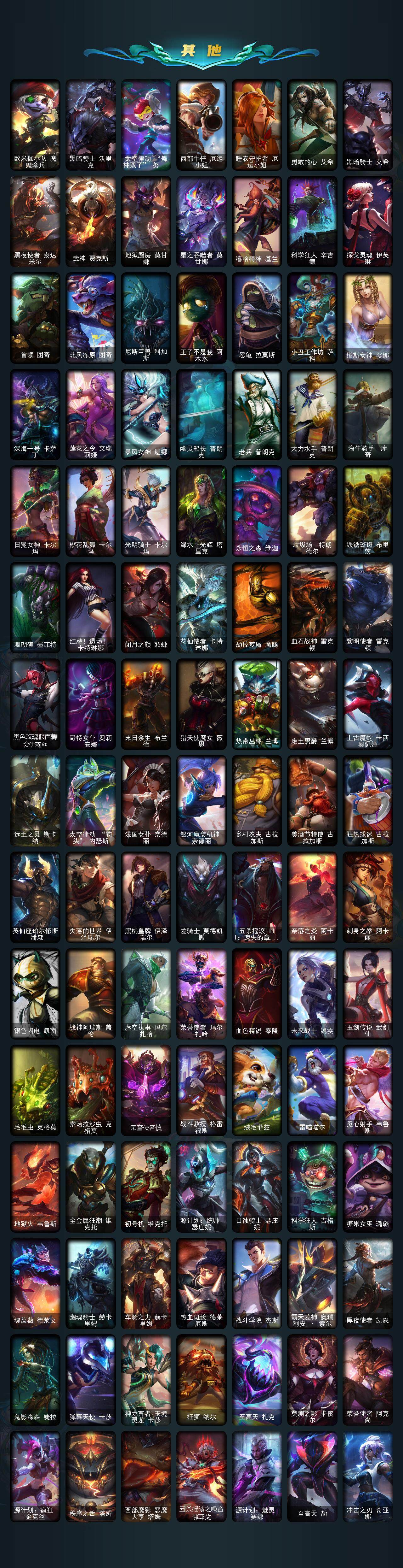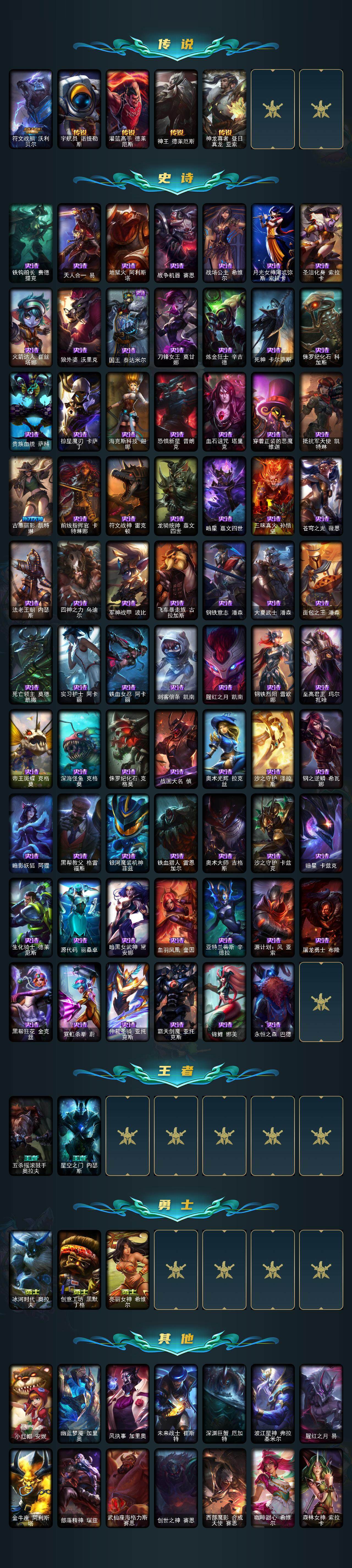 【传说皮肤】:地狱之门卫士加里奥,血石领主弗拉基米尔,战场女武神凯尔,恶魔男爵瑞兹,霸天零式赛恩,约德尔国队长提莫,驯龙炮手崔丝塔娜,合金巨兽努努和威朗普,幻灵战斗队长厄运小姐,鬼魂新娘莫甘娜,绅士科加斯,律政大亨蒙多,最终BOSS维迦,冰川巨兽墨菲特,源计划泯灭雷克顿,神龙尊者圣龙李青,银河魔装机神兰博,炼狱魔犬内瑟斯,神王盖伦,星之守护者拉克丝,黯黑魔龙希瓦娜,符文战熊沃利贝尔,宇航员诺提勒斯,灌篮高手德莱厄斯,神王德莱厄斯,神龙尊者昼日真龙亚索