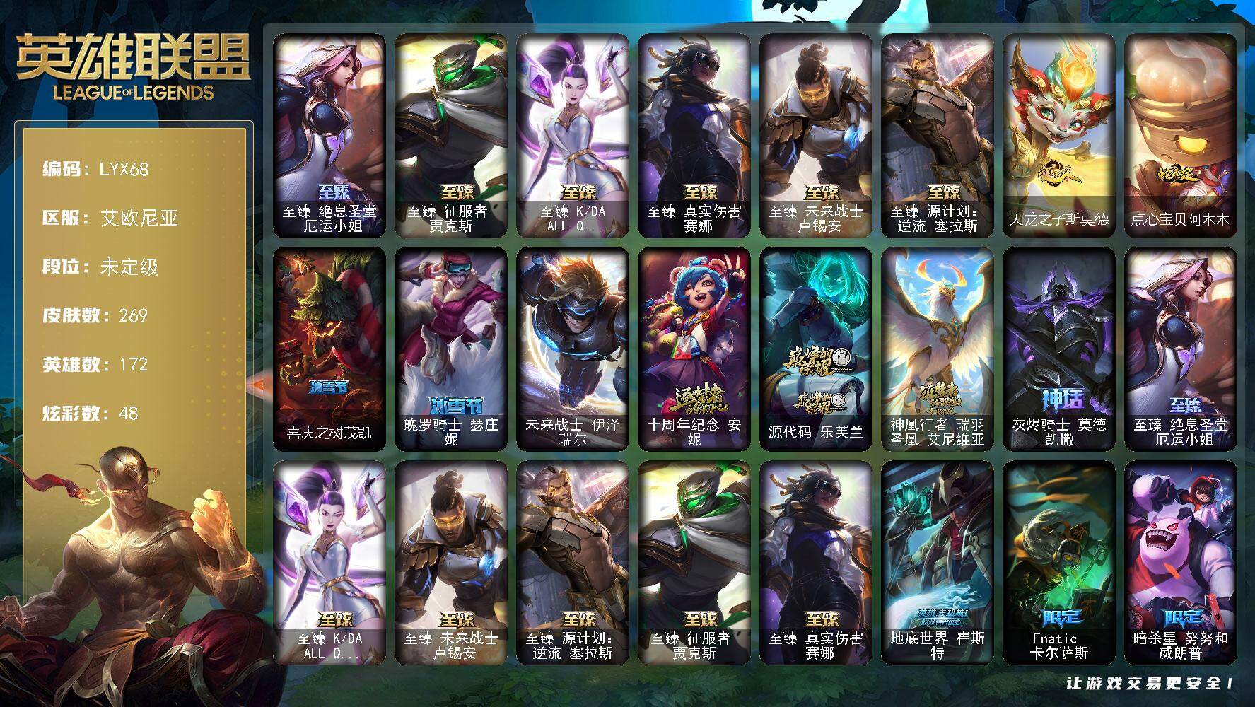 [15147790]未定级段位-172英雄-269皮肤-48炫彩-1终极-10神话-28限定-26传说-69史诗 【热门头像】:觅心之翼奎因头像 【至臻皮肤】:至臻绝息圣堂厄运小姐,至臻征服者贾克斯,至臻KDAALLOUT卡莎,至臻真实伤害赛娜,至臻未来战士卢锡安,至臻源计划逆流塞拉斯 【臻彩皮肤】:无畏骑士瑟庄妮赤子初心,星之守护者娑娜未来之光,玉剑传说无劫胭脂,可爱可爱粉红红布里茨,魔女阿卡丽虚荣,净雪之月莫甘娜冬虹 【年限皮肤】:天龙之子斯莫德,点心宝贝阿木木 【冰雪限定】:喜庆之树茂凯,魄罗骑士瑟庄妮 【终极皮肤】:未来战士伊泽瑞尔 【神话皮肤】:十周年纪念安妮,源代码乐芙兰,神凰行者瑞羽圣凰艾尼维亚,灰烬骑士莫德凯撒,至臻征服者贾克斯,至臻真实伤害赛娜,至臻绝息圣堂厄运小姐,至臻KDAALLOUT卡莎,至臻未来战士卢锡安,至臻源计划逆流塞拉斯 【限定皮肤】:地底世界崔斯特,Fnatic卡尔萨斯,暗杀星努努和威朗普,暗杀星慎,SKTT1卡莉丝塔,SSG伊泽瑞尔,胜利女神奥莉安娜,胜利之剑亚托克斯,胜利枪神卢锡安,胜利机器人布里茨,胜利女神瑟庄妮,胜利凤凰艾尼维亚,胜利之王泰达米尔,胜利女神娑娜,胜利剑圣易,胜利之运崔斯特,胜利女神菲奥娜,鬼影森森茂凯,魅惑女巫辛德拉,泳池派对奥莉安娜,暗影沃里克,野兽猎人泰达米尔,都铎王朝图奇,玉剑传说舞龙卫 【传说皮肤】:地狱之门卫士加里奥,血石领主弗拉基米尔,战场女武神凯尔,恶魔男爵瑞兹,霸天零式赛恩,约德尔国队长提莫,驯龙炮手崔丝塔娜,合金巨兽努努和威朗普,幻灵战斗队长厄运小姐,鬼魂新娘莫甘娜,绅士科加斯,律政大亨蒙多,最终BOSS维迦,冰川巨兽墨菲特,源计划泯灭雷克顿,神龙尊者圣龙李青,银河魔装机神兰博,炼狱魔犬内瑟斯,神王盖伦,星之守护者拉克丝,黯黑魔龙希瓦娜,符文战熊沃利贝尔,宇航员诺提勒斯,灌篮高手德莱厄斯,神王德莱厄斯,神龙尊者昼日真龙亚索 【史诗皮肤】:铁钩船长费德提克,天人合一易,地狱火阿利斯塔,战争机器赛恩,战场公主希维尔,月光女神阿忒弥斯索拉卡,圣洁化身索拉卡,火箭达人崔丝塔娜,狼外婆沃里克,国王泰达米尔,刀锋女王莫甘娜,炼金狂士辛吉德,死神卡尔萨斯,侏罗纪化石科加斯,贵族血统萨科,掠星魔刃卡萨丁,海克斯科技迦娜,恐惧新星普朗克,血石诅咒塔里克,穿着正装的恶魔维迦,抵抗军天使凯特琳,古墓丽影凯特琳,前线指挥官卡特琳娜,