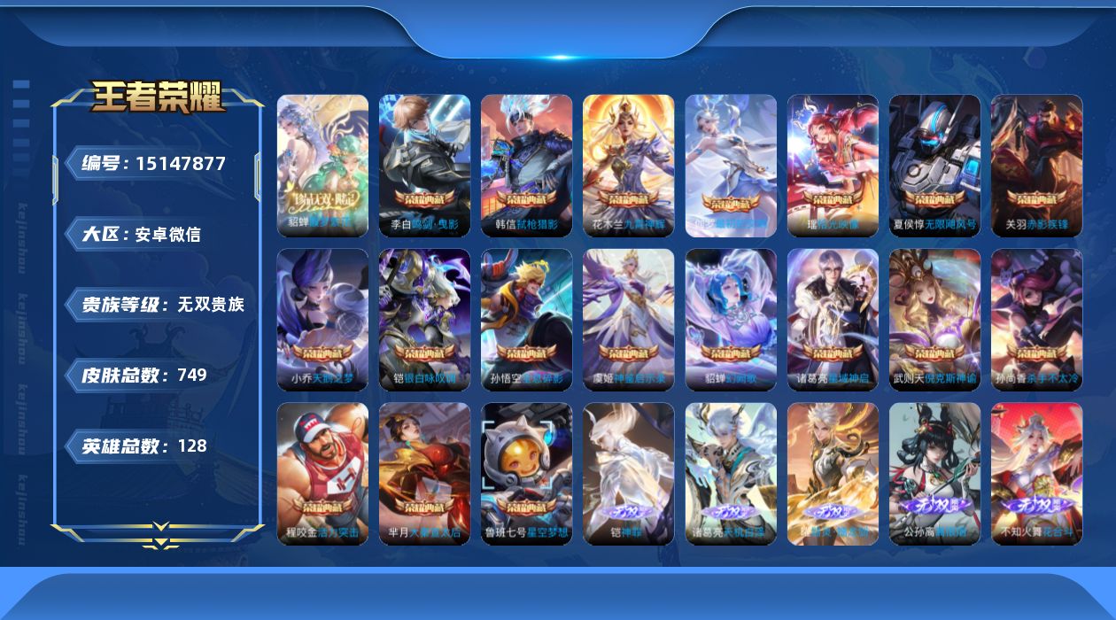 [15147877]全满皮一个不差!4小国服!魔方亮!中路67段/打野40段 安卓WX-V11-最强王者段位-128英雄-748皮肤-18典藏皮肤-1典藏英雄-1珍品无双-12无双-9珍品传说-131传说-265史诗 【英雄全皮】:廉颇全皮,小乔全皮,赵云全皮,墨子全皮,妲己全皮,嬴政全皮,孙尚香全皮,鲁班七号全皮,庄周全皮,刘禅全皮,高渐离全皮,阿轲全皮,钟无艳全皮,孙膑全皮,扁鹊全皮,白起全皮,芈月全皮,吕布全皮,周瑜全皮,元歌全皮,夏侯惇全皮,甄姬全皮,曹操全皮,典韦全皮,宫本武藏全皮,李白全皮,马可波罗全皮,狄仁杰全皮,达摩全皮,项羽全皮,武则天全皮,司马懿全皮,老夫子全皮,关羽全皮,貂蝉全皮,安琪拉全皮,程咬金全皮,露娜全皮,姜子牙全皮,刘邦全皮,韩信全皮,孙权全皮,王昭君全皮,兰陵王全皮,花木兰全皮,艾琳全皮,张良全皮,不知火舞全皮,朵莉亚全皮,娜可露露全皮,橘右京全皮,亚瑟全皮,孙悟空全皮,牛魔全皮,后羿全皮,刘备全皮,张飞全皮,李元芳全皮,虞姬全皮,钟馗全皮,杨玉环全皮,苍全皮,杨戬全皮,女娲全皮,哪吒全皮,干将莫邪全皮,雅典娜全皮,蔡文姬全皮,太乙真人全皮,东皇太一全皮,鬼谷子全皮,诸葛亮全皮,大乔全皮,黄忠全皮,铠全皮,苏烈全皮,百里玄策全皮,百里守约全皮,弈星全皮,梦奇全皮,公孙离全皮,沈梦溪全皮,明世隐全皮,裴擒虎全皮,狂铁全皮,米莱狄全皮,瑶全皮,云中君全皮,李信全皮,伽罗全皮,盾山全皮,孙策全皮,猪八戒全皮,上官婉儿全皮,亚连全皮,嫦娥全皮,大司命全皮,马超全皮,海月全皮,曜全皮,西施全皮,蒙犽全皮,鲁班大师全皮,蒙恬全皮,澜全皮,盘古全皮,镜全皮,阿古朵全皮,桑启全皮,夏洛特全皮,司空震全皮,云缨全皮,金蝉全皮,暃全皮,赵怀真全皮,莱西奥全皮,戈娅全皮,空空儿全皮,影全皮,海诺全皮,姬小满全皮,少司缘全皮 【荣耀典藏】:武则天英雄,孙悟空全息碎影,武则天倪克斯神谕,夏侯惇无限飓风号,小乔天鹅之梦,孙尚香杀手不太冷,鲁班七号星空梦想,芈月大秦宣太后,程咬金活力突击,李白鸣剑曳影,诸葛亮星域神启,花木兰九霄神辉,关羽赤影疾锋,铠银白咏叹调,貂蝉幻阙歌,韩信弑枪猎影,虞姬神鉴启示录,瑶拾光映像,伽罗最初的交响 【珍品无双】:貂蝉馥梦繁花 【无双皮肤】:武则天神器明辉仪,妲己青丘九尾,瑶真我赫兹,李白碎月剑心,小乔时之魔女,韩信群星魔术团,不知火舞花合斗,公孙离