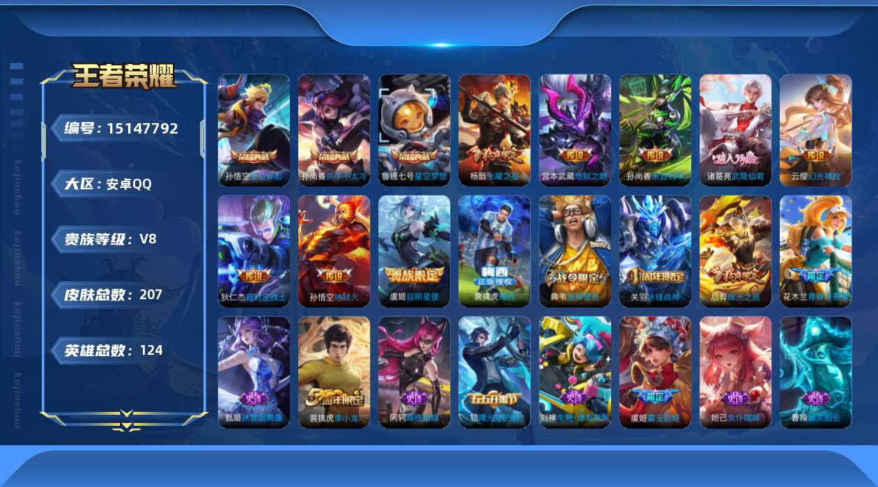 [15147792]【店主推荐捡漏号!可直接换绑】安卓Q-V8-至尊星耀III段位-123英雄-207皮肤-3典藏皮肤-9传说-40史诗 【英雄全皮】:影全皮 【荣耀典藏】:孙悟空全息碎影,孙尚香杀手不太冷,鲁班七号星空梦想 【传说皮肤】:后羿神树通天,云缨幻光神枪,虞姬启明星使,杨戬永曜之星,诸葛亮武陵仙君,孙尚香末日机甲,宫本武藏地狱之眼,孙悟空地狱火,狄仁杰超时空战士 【限定皮肤】:姜子牙天穹之誓,狄仁杰阴阳师,赵云皇家上将,孙尚香蔷薇恋人,高渐离死亡摇滚,芈月重明,夏侯惇朔风刀,曹操烛龙,典韦穷奇,典韦蓝屏警告,狄仁杰魔术师,狄仁杰万华元夜,达摩沙漠行僧,项羽海滩派对,老夫子醍醐杖,关羽冰锋战神,程咬金演武夺筹,兰陵王金庭之子,花木兰青春决赛季,牛魔御旌,后羿辉光之辰,李元芳云中旅人,虞姬霸王别姬,虞姬启明星使,钟馗驱傩正仪,杨玉环遇见飞天,杨戬永曜之星,女娲朔望之晖,蔡文姬繁星吟游,鬼谷子原初探秘者,诸葛亮武陵仙君,苏烈千军破阵,弈星混沌棋,沈梦溪大漠名商,明世隐疑决卦,裴擒虎李小龙,裴擒虎擒涛扼浪,狂铁御狮,米莱狄御霄,盾山御銮,上官婉儿梁祝,鲁班大师探海日志,桑启海盐诗旅,张良古海寻踪,裴擒虎梅西,鬼谷子天穹祈灯,刘邦剑破天穹 【年限皮肤】:杨戬永曜之星,后羿辉光之辰 【赛季限定】:芈月重明,夏侯惇朔风刀,曹操烛龙,典韦穷奇,狄仁杰万华元夜,达摩沙漠行僧,老夫子醍醐杖,程咬金演武夺筹,兰陵王金庭之子,张良古海寻踪,牛魔御旌,李元芳云中旅人,钟馗驱傩正仪,鬼谷子原初探秘者,苏烈千军破阵,弈星混沌棋,沈梦溪大漠名商,明世隐疑决卦,裴擒虎擒涛扼浪,狂铁御狮,米莱狄御霄,盾山御銮,鲁班大师探海日志,桑启海盐诗旅,鬼谷子天穹祈灯,刘邦剑破天穹,姜子牙天穹之誓 【战令限定】:典韦蓝屏警告,女娲朔望之晖 【史诗皮肤】:阿轲暗夜猫娘,赵云皇家上将,貂蝉圣诞恋歌,甄姬冰雪圆舞曲,王昭君偶像歌手,狄仁杰魔术师,宫本武藏鬼剑武藏,孙尚香蔷薇恋人,孙尚香水果甜心,嬴政摇滚巨星,妲己魅力维加斯,妲己女仆咖啡,墨子龙骑士,墨子金属风暴,吕布圣诞狂欢,曹操幽灵船长,李白千年之狐,张飞乱世虎臣,虞姬霸王别姬,关羽冰锋战神,刘邦德古拉伯爵,小乔缤纷独角兽,兰陵王暗隐猎兽者,诸葛亮黄金分割率,雅典娜冰冠公主,后羿辉光之辰,花木兰青春决赛季,铠曙光守护者,裴擒虎梅西,白起星夜王子,杨玉环遇见飞天,大乔猫狗日
