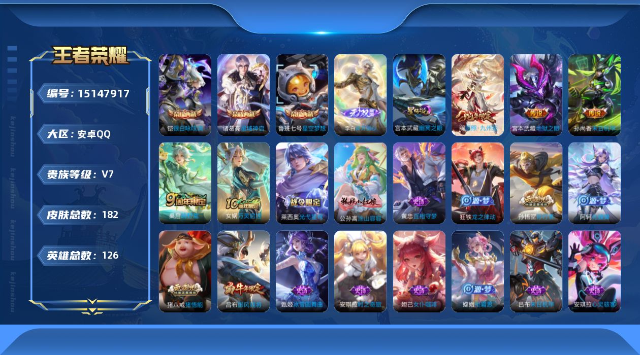 [15147917]【店主推荐捡漏号!可直接换绑】安卓Q-V7-最强王者段位-126英雄-182皮肤-3典藏皮肤-1无双-5传说-1星传说-48史诗