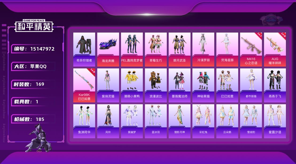 [15147972]【店主推荐捡漏号!可直接换绑】 苹果 手Q-5粉装-3特效枪-1载具-2粉色飞行器-6.2w热力值-5王牌印记-169套装-185枪皮【热门品类】:套装-奇异狩猎者,套装-潮萌小黄鸭,套装-浪漫波比【粉色载具】:海龙奔腾【粉色套装】:粉装-PEL轰鸣竞梦者,粉装-草莓生巧,粉装-朗月武圣,角色-冷漠罗丽,角色-荧海星豚【粉色枪皮等级】:M416-心之恋语(七级),AUG-暖羊咩咩(五级),Kar98K-巳巳如意(五级)【粉色飞行器】:极意拳锋飞行器