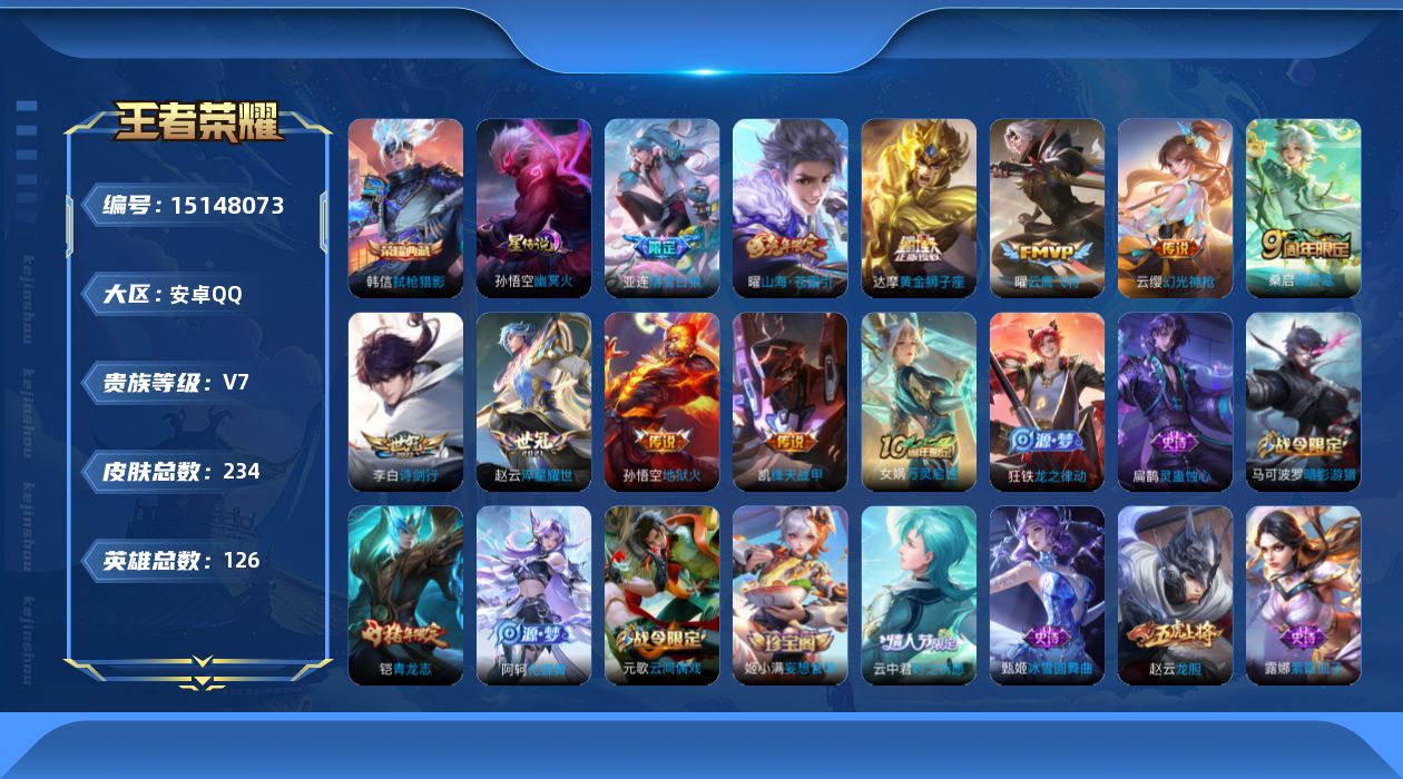 [15148073]可二次【店主推荐捡漏号!可直接换绑】,安卓Q-V7-最强王者段位-126英雄-234皮肤-1典藏皮肤-11传说-51史诗 【英雄全皮】:影全皮 【荣耀典藏】:韩信弑枪猎影 【传说皮肤】:后羿神树通天,云缨幻光神枪,桑启鸣野蒿,亚连落雪白狼,曜山海苍雷引,李白诗剑行,赵云淬星耀世,铠绛天战甲,曜云鹰飞将,达摩黄金狮子座,孙悟空地狱火 【限定皮肤】:姜子牙天穹之誓,杨戬破阵退雄兵,狄仁杰阴阳师,赵云皇家上将,赵云龙胆,孙尚香蔷薇恋人,庄周高山流水,元歌云间偶戏,元歌无心,马可波罗暗影游猎,狄仁杰魔术师,狄仁杰万华元夜,达摩沙漠行僧,项羽海滩派对,老夫子醍醐杖,程咬金演武夺筹,兰陵王金庭之子,亚瑟潮玩骑士王,李元芳云中旅人,钟馗驱傩正仪,太乙真人华丽摇滚,鬼谷子原初探秘者,鬼谷子五谷丰年,铠青龙志,苏烈千军破阵,百里玄策原初追逐者,弈星混沌棋,沈梦溪大漠名商,明世隐疑决卦,裴擒虎李小龙,裴擒虎擒涛扼浪,云中君纤云弄巧,云中君时之祈愿,嫦娥暖冬兔眠,曜山海苍雷引,鲁班大师探海日志,桑启海盐诗旅,暃星界游侠,艾琳女武神,阿古朵江河有灵,张良古海寻踪,蒙恬荣光圣徽,鬼谷子天穹祈灯,姬小满妄想食味,亚连落雪白狼,刘邦剑破天穹,程咬金群星魔术团,刘备异域游侠,周瑜熔金海岸 【年限皮肤】:铠青龙志,赵云龙胆,曜山海苍雷引 【赛季限定】:狄仁杰万华元夜,达摩沙漠行僧,老夫子醍醐杖,程咬金演武夺筹,兰陵王金庭之子,张良古海寻踪,李元芳云中旅人,钟馗驱傩正仪,鬼谷子原初探秘者,苏烈千军破阵,百里玄策原初追逐者,弈星混沌棋,沈梦溪大漠名商,明世隐疑决卦,裴擒虎擒涛扼浪,鲁班大师探海日志,桑启海盐诗旅,鬼谷子天穹祈灯,蒙恬荣光圣徽,刘邦剑破天穹,姜子牙天穹之誓 【战令限定】:元歌云间偶戏,马可波罗暗影游猎,亚瑟潮玩骑士王,嫦娥暖冬兔眠,暃星界游侠 【史诗皮肤】:项羽苍穹之光,露娜紫霞仙子,赵云皇家上将,赵云未来纪元,甄姬冰雪圆舞曲,王昭君偶像歌手,狄仁杰魔术师,宫本武藏鬼剑武藏,孙尚香蔷薇恋人,孙尚香水果甜心,妲己魅力维加斯,妲己女仆咖啡,墨子金属风暴,曹操幽灵船长,吕布末日机甲,花木兰水晶猎龙者,小乔缤纷独角兽,兰陵王暗隐猎兽者,安琪拉心灵骇客,百里守约特工魅影,铠曙光守护者,白起星夜王子,阿轲节奏热浪,孙策猫狗日记,铠青龙志,伽罗箭羽风息,狄仁杰鹰眼统帅,赵云龙胆,孙尚香时之恋人,马可波