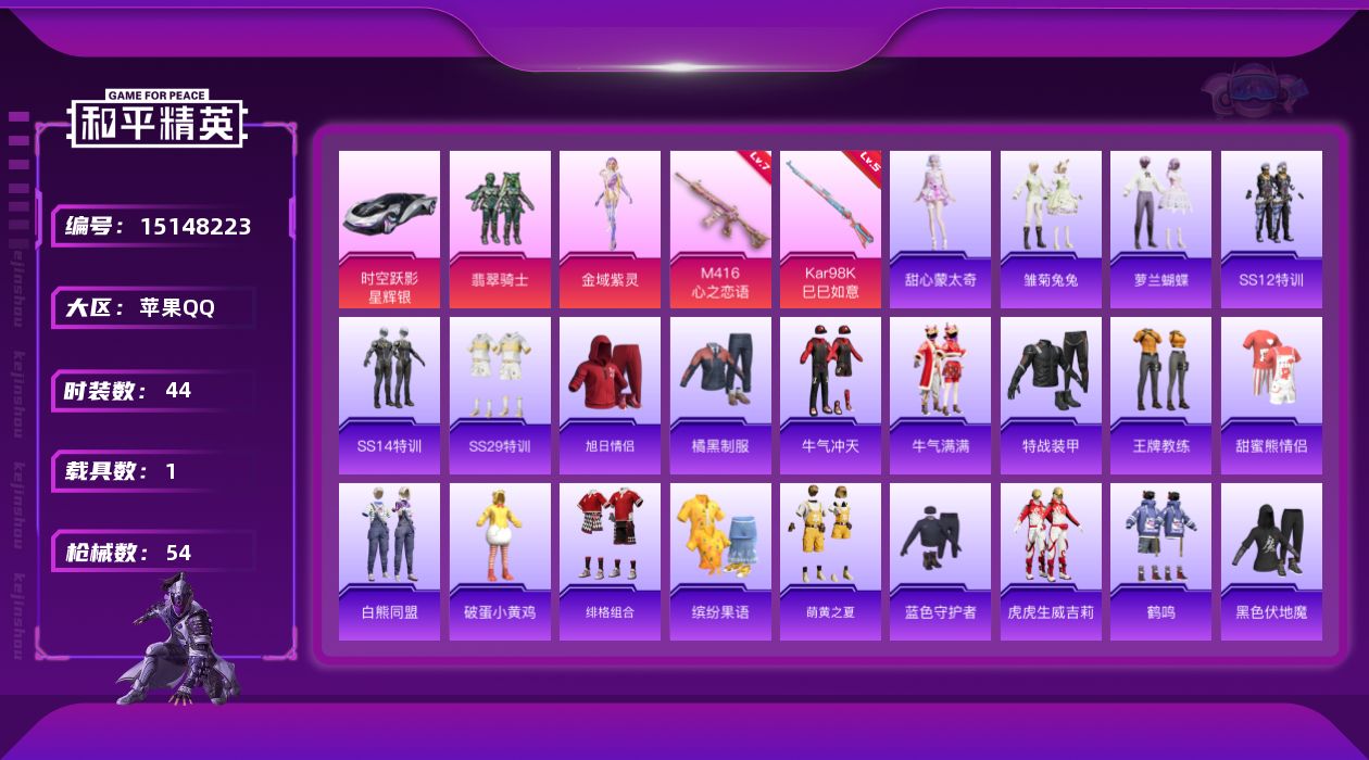 [15148223]可二次【店主推荐捡漏号!可直接换绑】苹果 手Q-2粉装-2特效枪-1载具-1粉色飞行器-2.25w热力值-1王牌印记-44套装-54枪皮