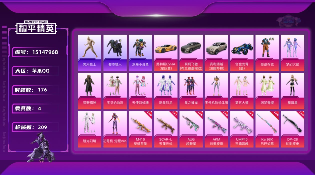 [15147968]可二次【店主推荐捡漏号!可直接换绑】/素材身法号/老木乃伊/无敌战神框1/地铁满天赋/M416-至情至圣(九级) 苹果 手Q-无敌战神框-13粉装-12特效枪-4载具-3粉色飞行器-7.9w热力值-16王牌印记-176套装-209枪皮【热门品类】:粉装-怪诞乔克,粉装-梦幻火箭,套装-浪漫天命,套装-都市猎人,套装-冥河战士,套装-深海小丑鱼,角色-军刀雅典娜,套装-SS1特训,旭日初心兜帽大衣,套装-龟仙人,套装-暗影哥特,套装-浪漫波比,套装-粉红小猪,套装-红红火火,角色-8号机,角色-Mark.06,熔岩游骑兵连帽夹克【粉色载具】:路特斯EVIJA(星际黄),宾利飞驰(布罗德盖棕双色),宾利添越(浅瞪羚棕),合金龙骨(蓝)【粉色套装】:粉装-荒野猎神,粉装-怪诞乔克,粉装-宝贝奶油派,粉装-天使彩虹糖,粉装-梦幻火箭,粉装-新星烈龙,粉装-星之彼岸,角色-零号机款机体服,粉装-第五大道,粉装-闲梦青缨,角色-蔷薇星,粉装-镜光幻境,角色-初号机 觉醒Ver.【粉色枪皮等级】:AKM-炫紫旋律(五级),SCAR-L-天蓬元帅(七级),M416-五爪金龙(一级),M416-心之恋语(四级),M416-至情至圣(九级),M416-超新星(三级),AUG-超新星(六级),UMP45-玉魂晶魄(五级),Kar98K-巳巳如意(五级),M24-莲影清波(三级),DP-28-圣堂之誓(二级),DP-28-豹影疾电(四级)【粉色飞行器】:镜光幻境飞行翼
